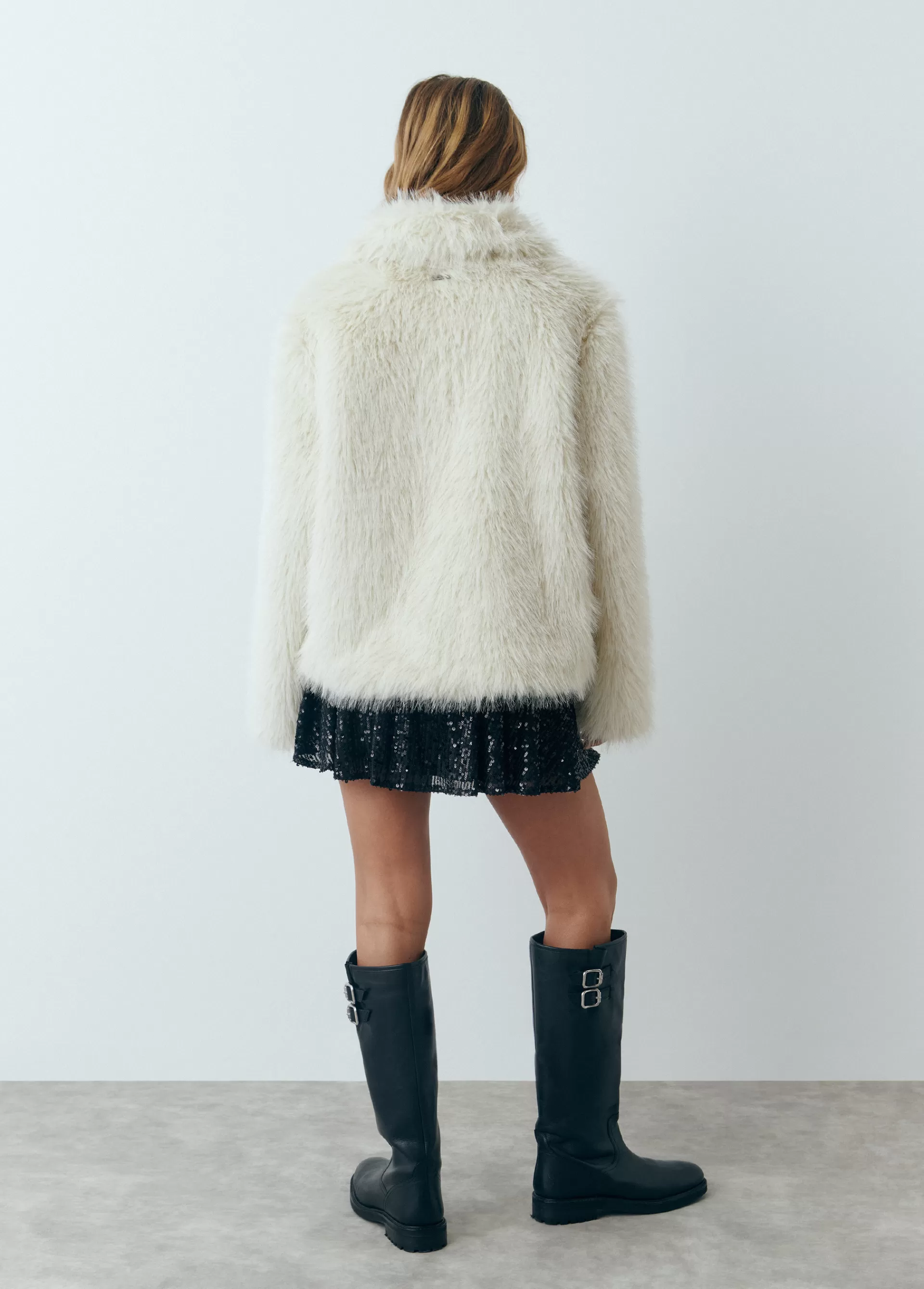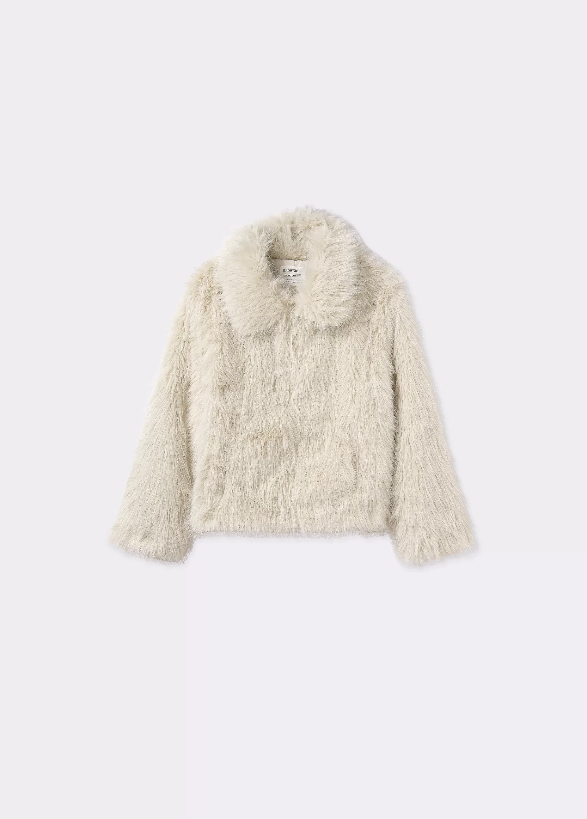 Abrigo corto efecto pelo con cuello y bolsillos.