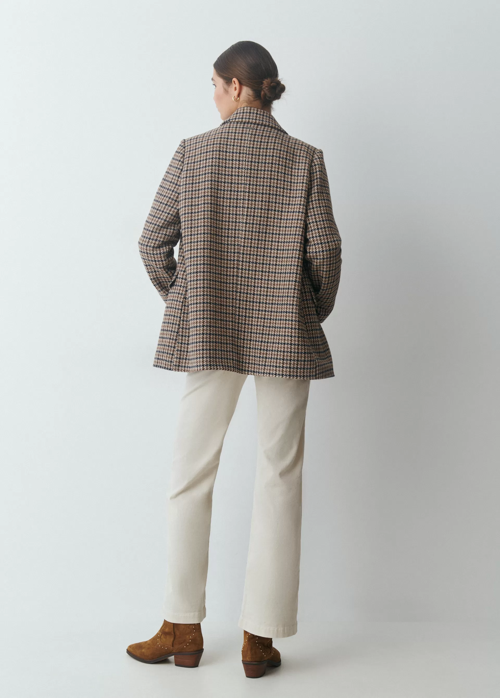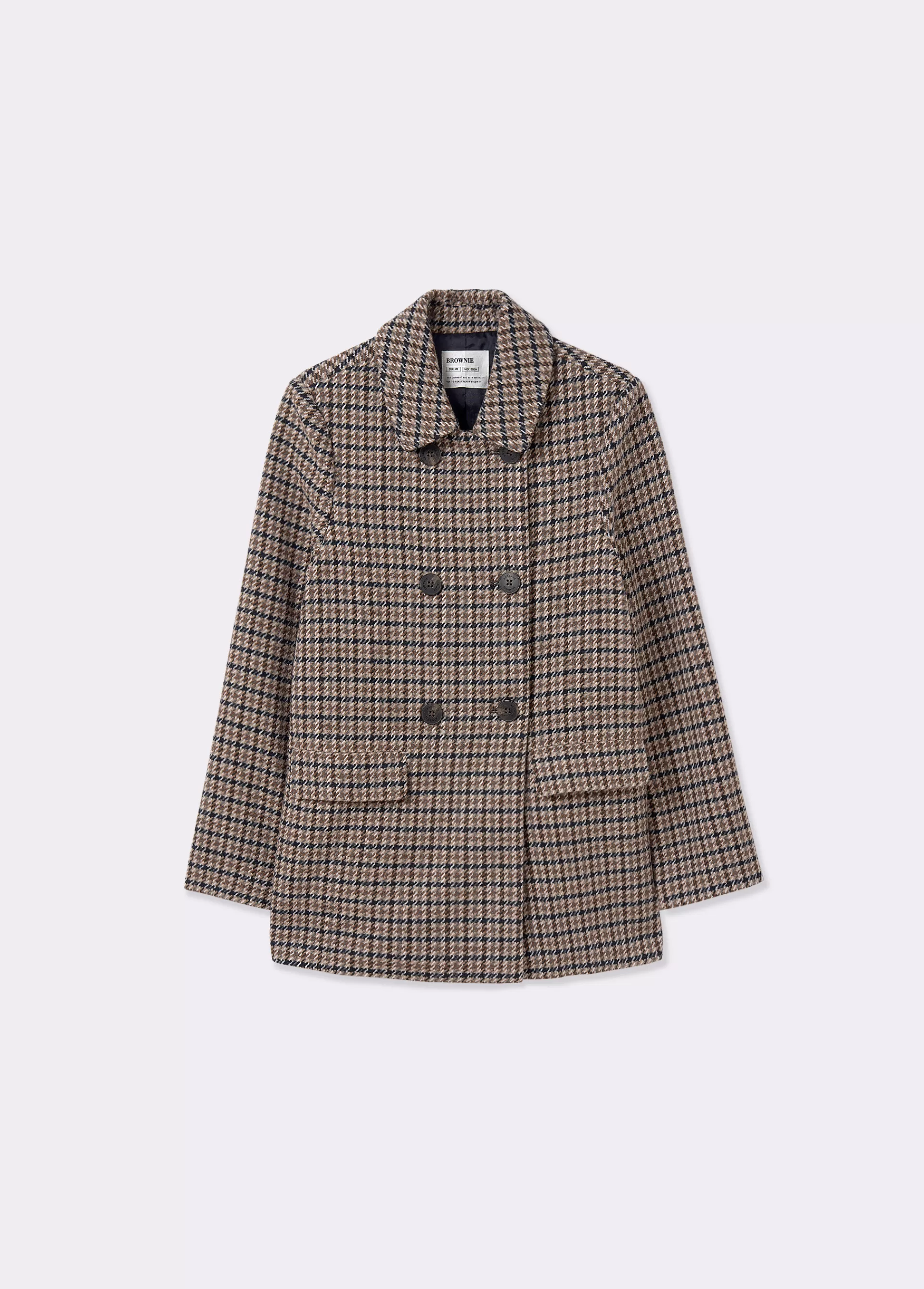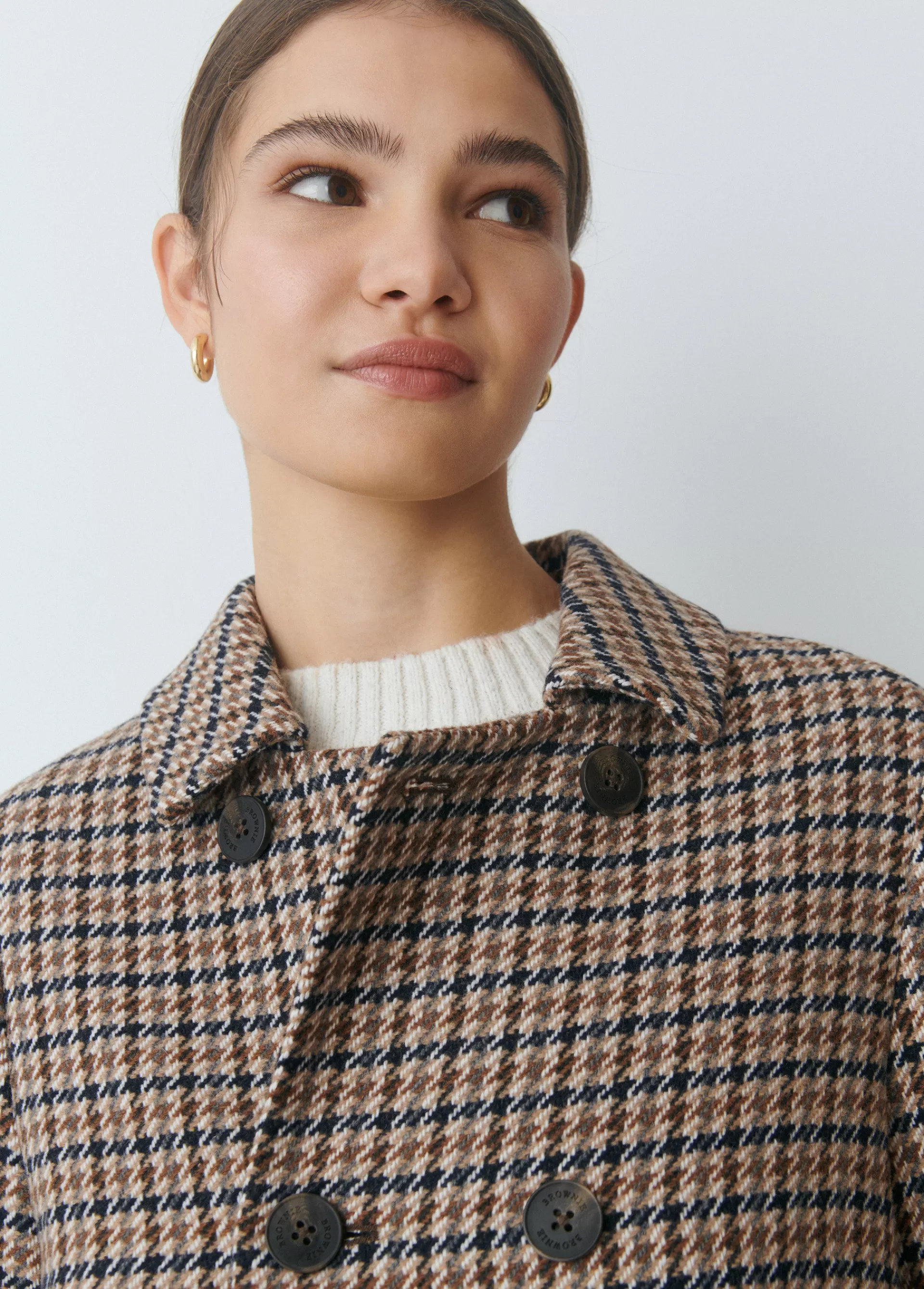 Abrigo corto entallado con solapas de cuadros. Cierre mediante botones en la parte frontal.