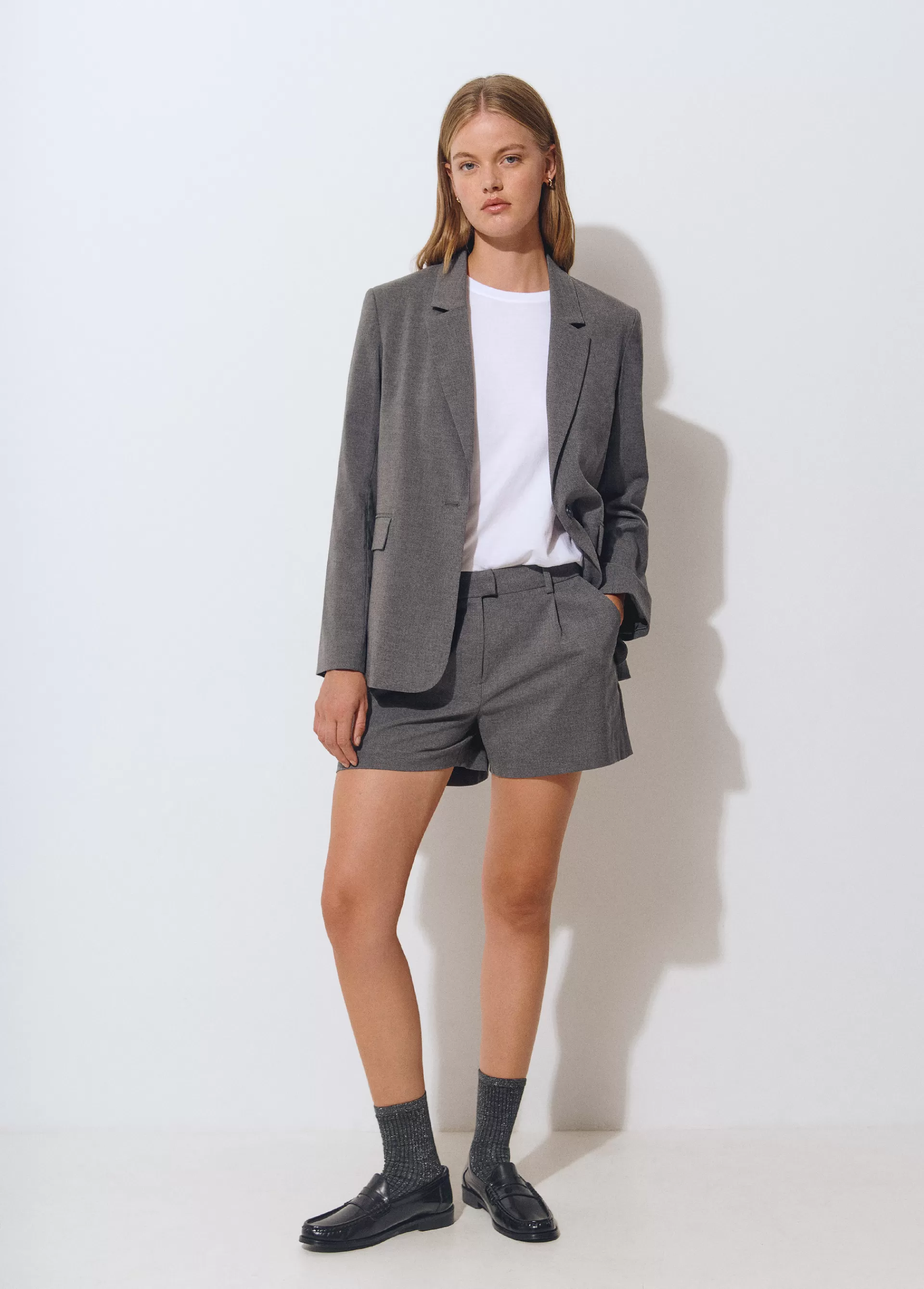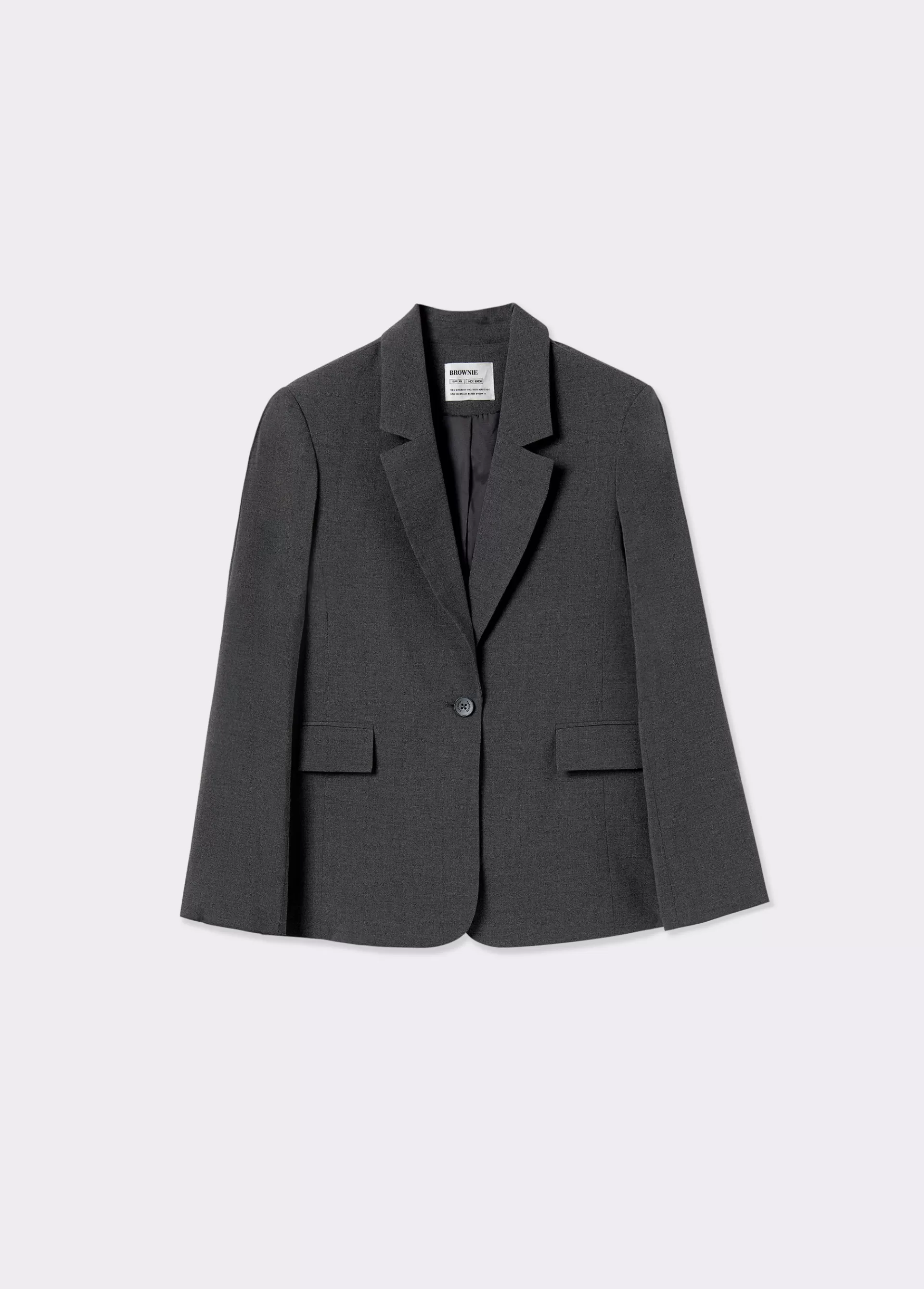 Americana lisa de manga larga, cuello con solapas, bolsillos y cierre mediante botón en el frontal.