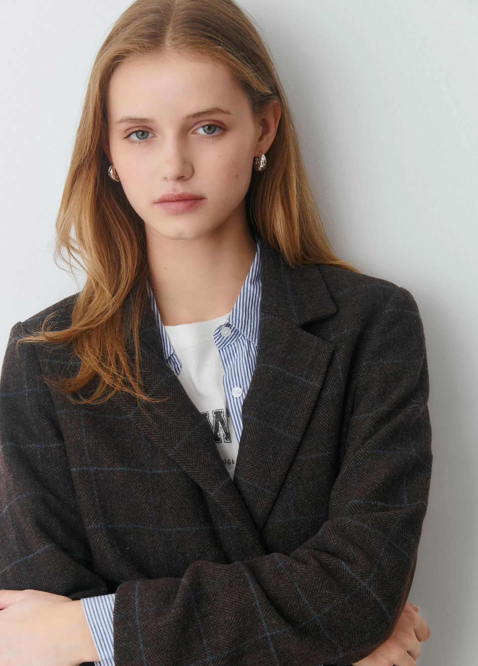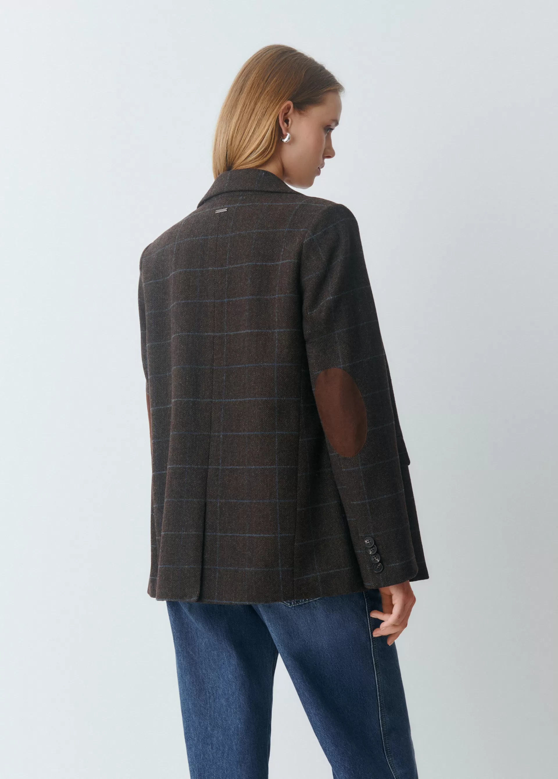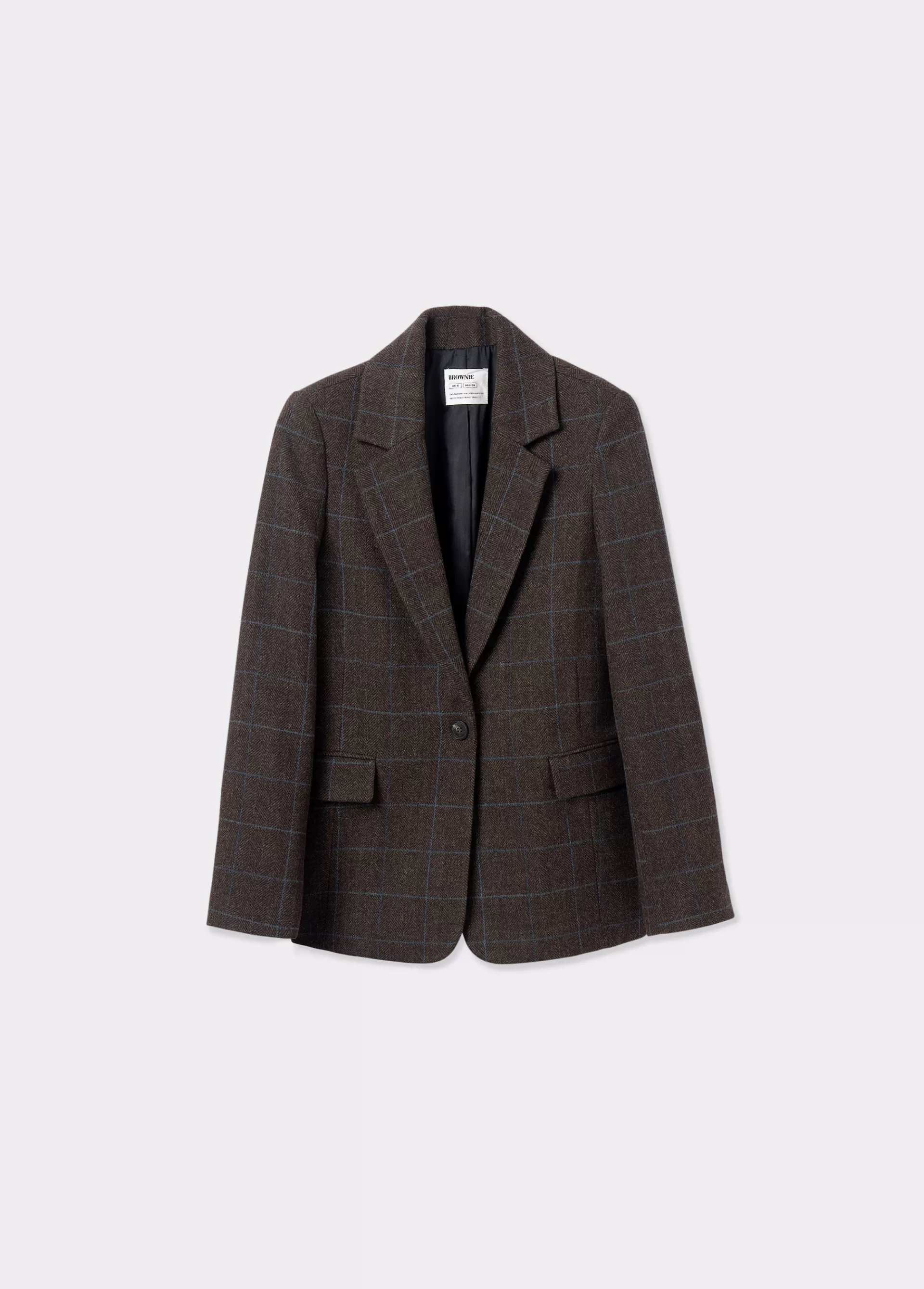 Americana con tejido de espiga de manga larga, cuello con solapas y bolsillos. Cierre mediante botón en el frontal.