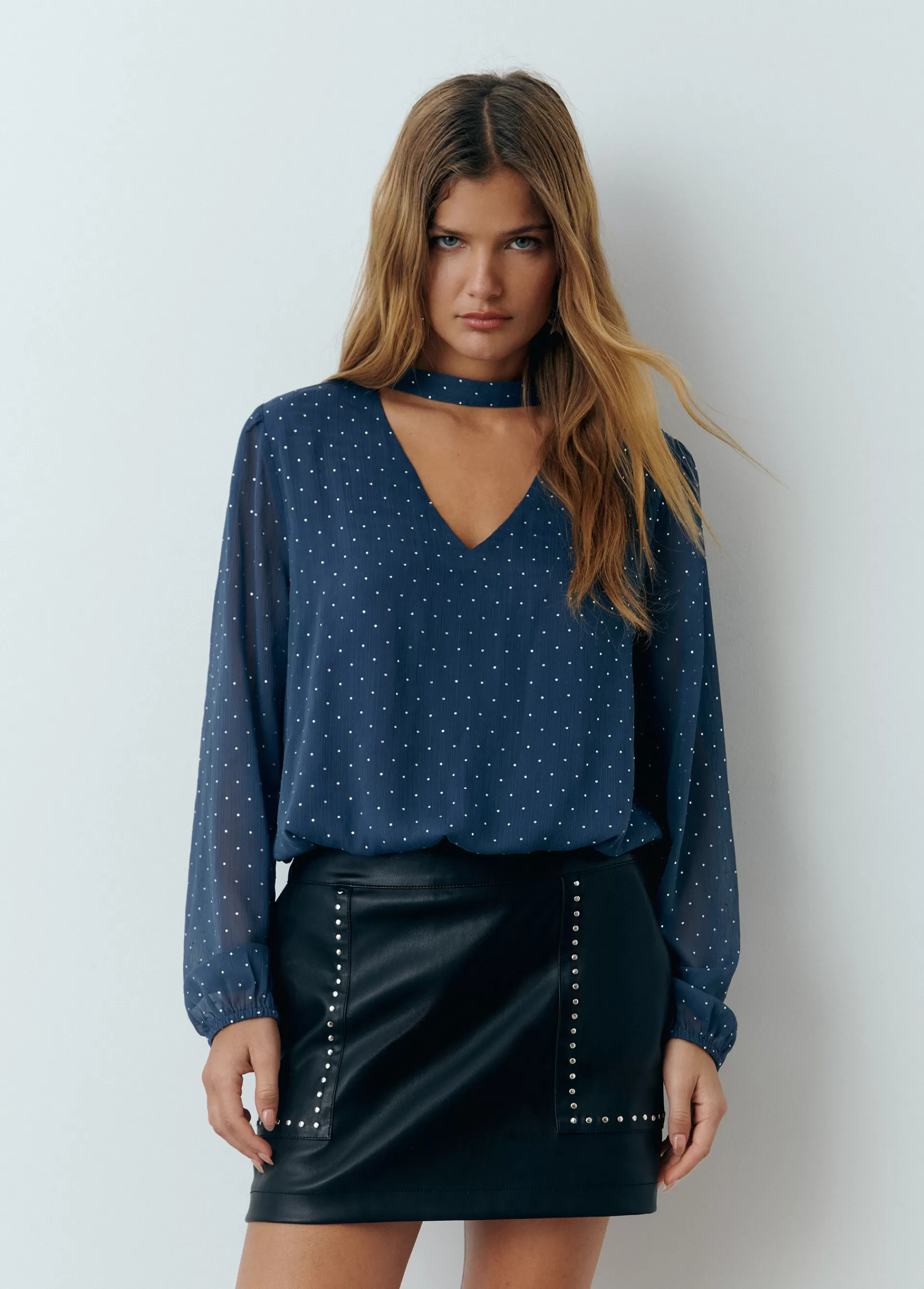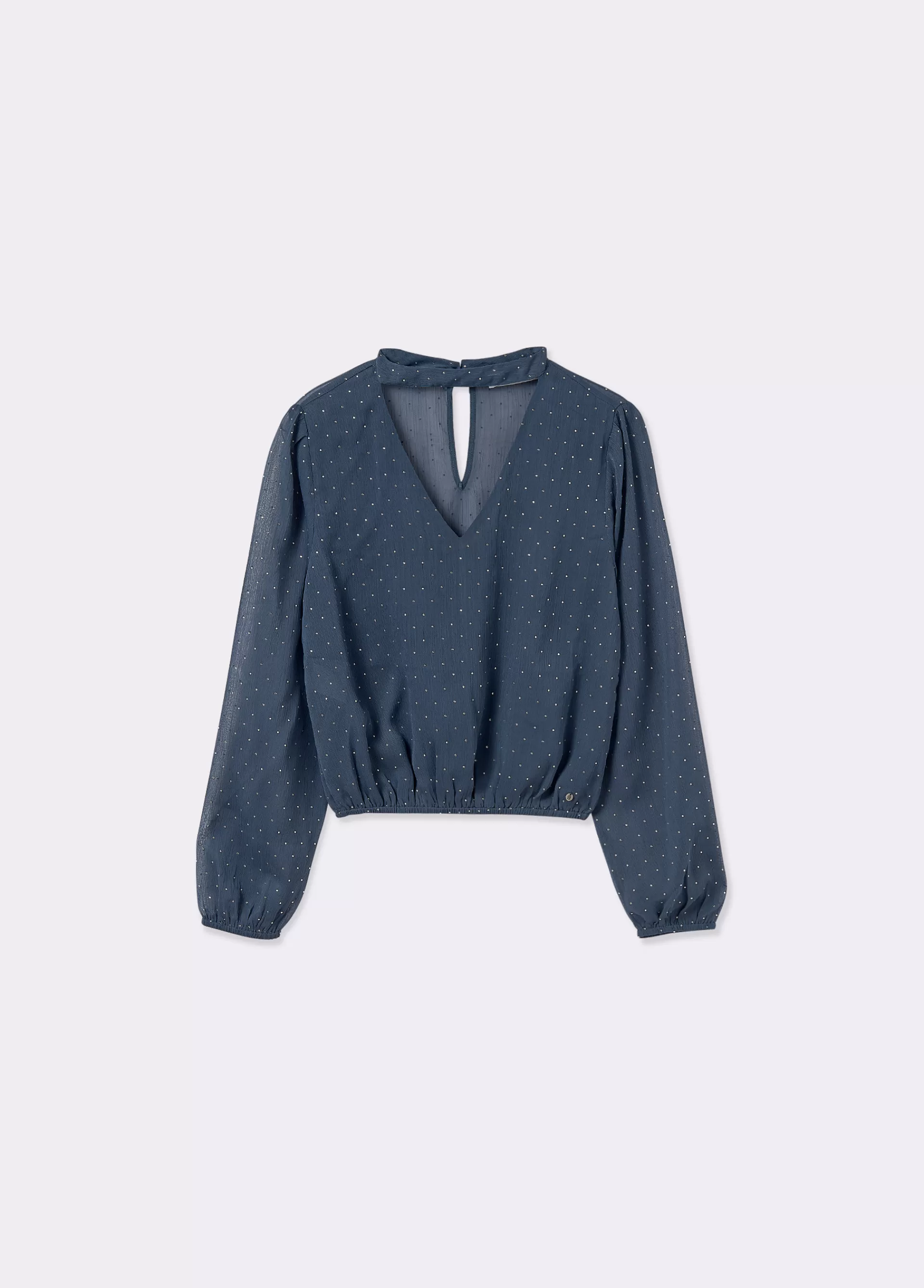 Blusa de manga larga abullonada, cuello de pico con chocker y estampado con brillos.