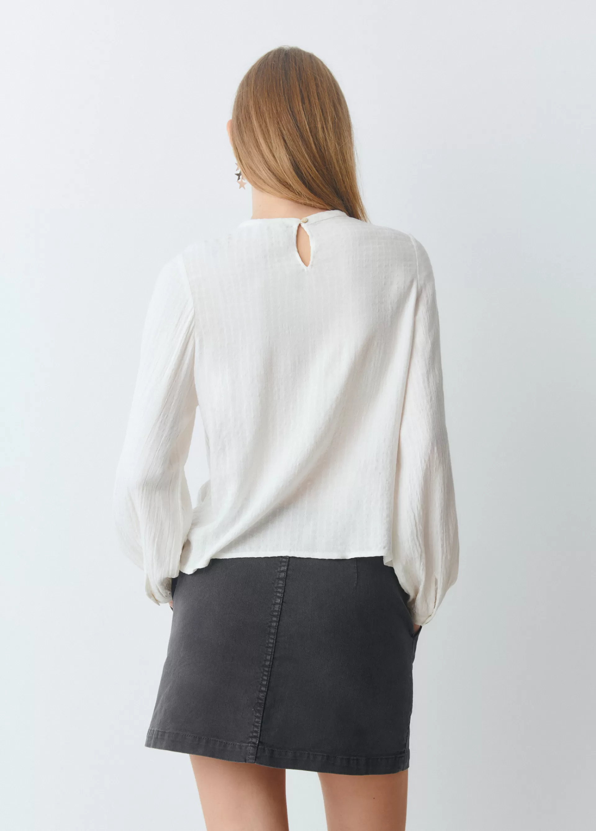 Blusa lisa de manga larga abullonada con smock, cuello redondo y volantes.
