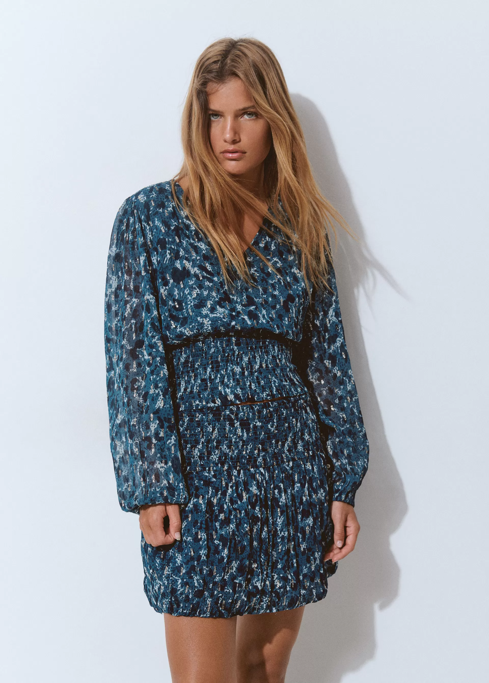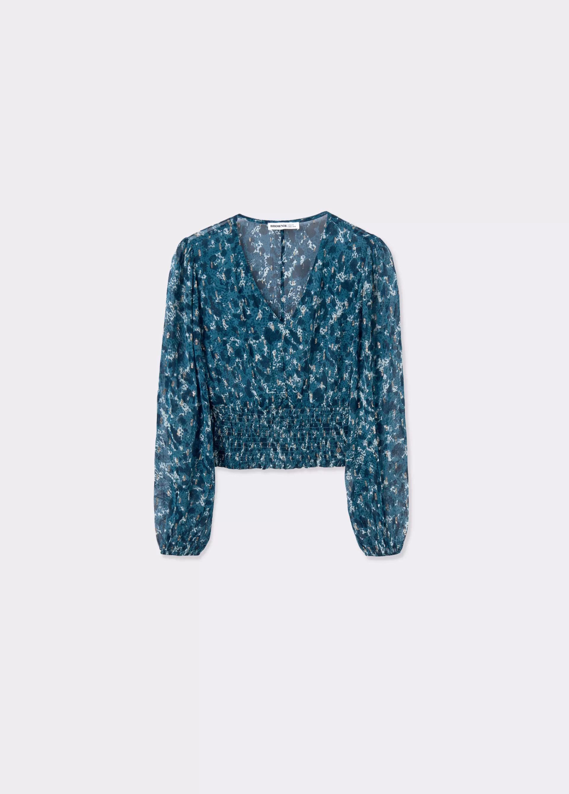 Blusa estampada de manga larga abullonada, cuello de pico y smock en la cintura con lurex.