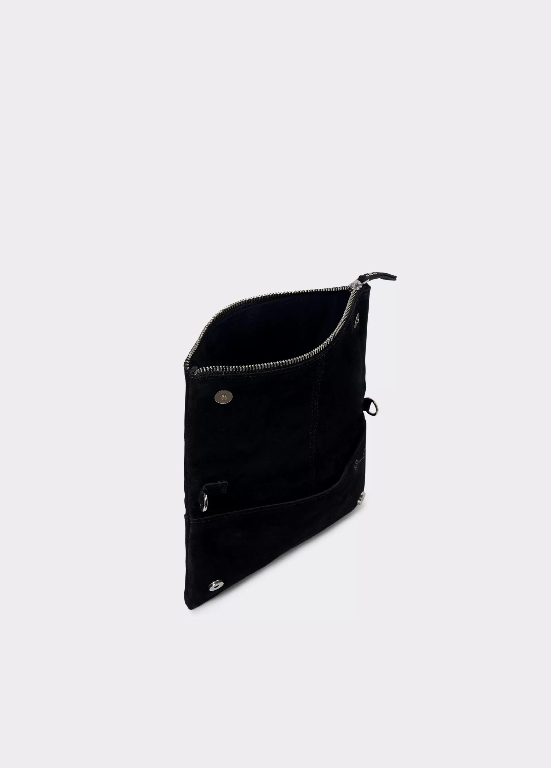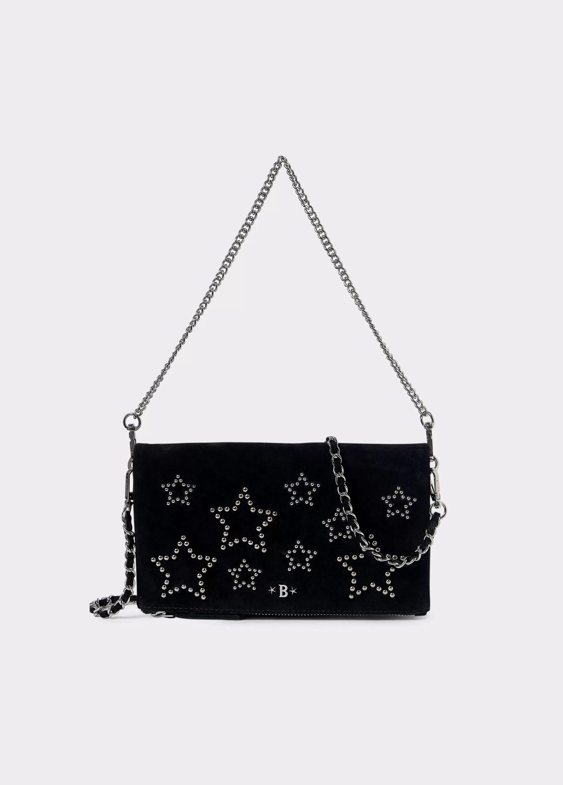 Bolso de hombro de piel en color negro con detalle de estrellas con tachas en la parte delantera. Dispone de doble correa, ambas extraíbles; una más corta para colgar del hombro y otra más larga para llevar de bandolera.