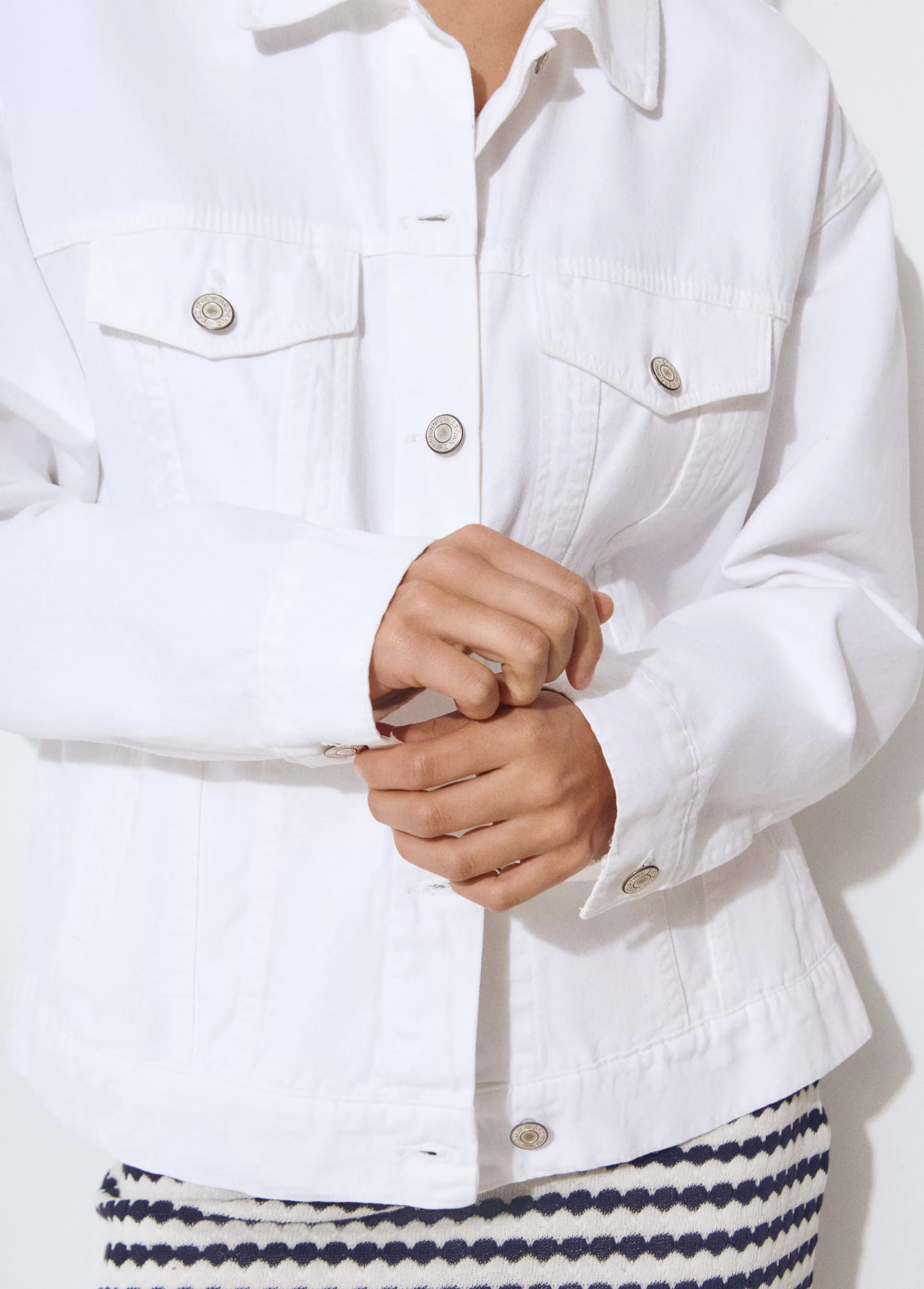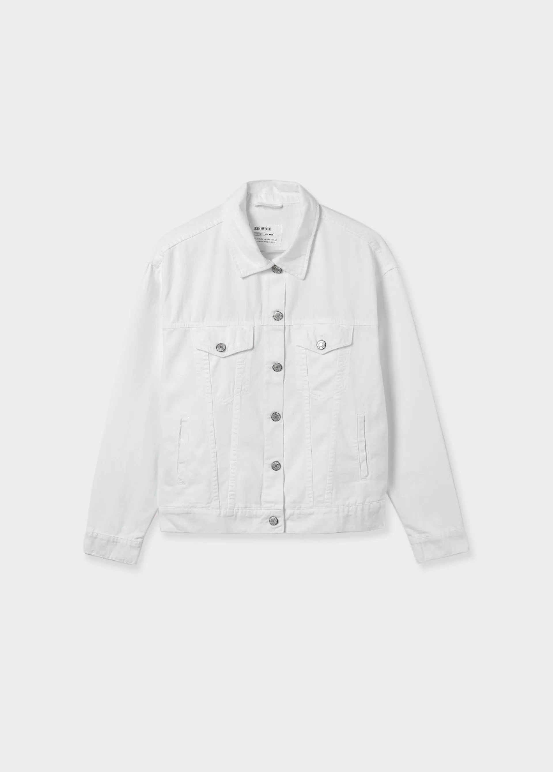 Chaqueta tejana oversize de manga larga, cuello con solapas, bolsillos frontales y cierre mediante botones.