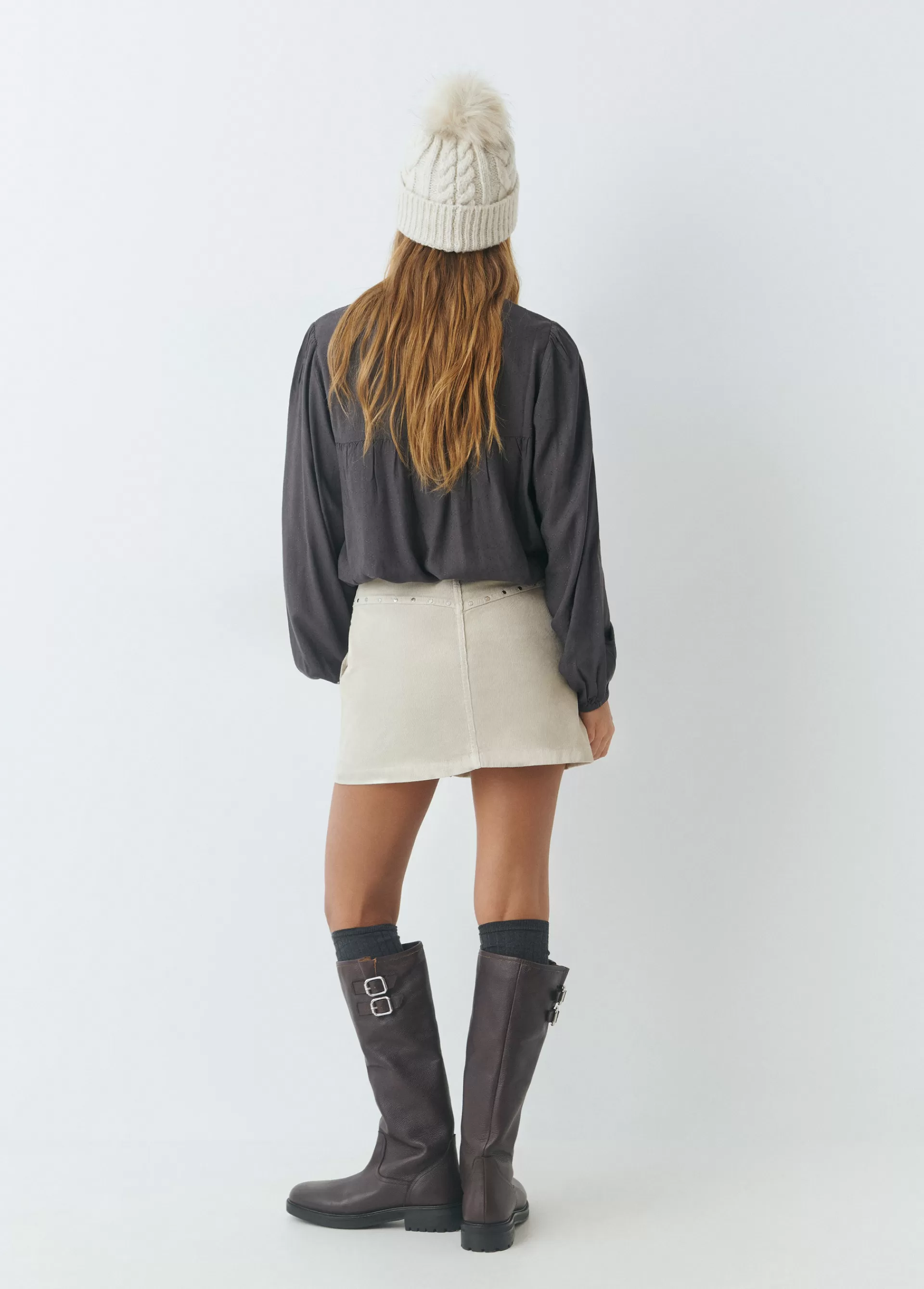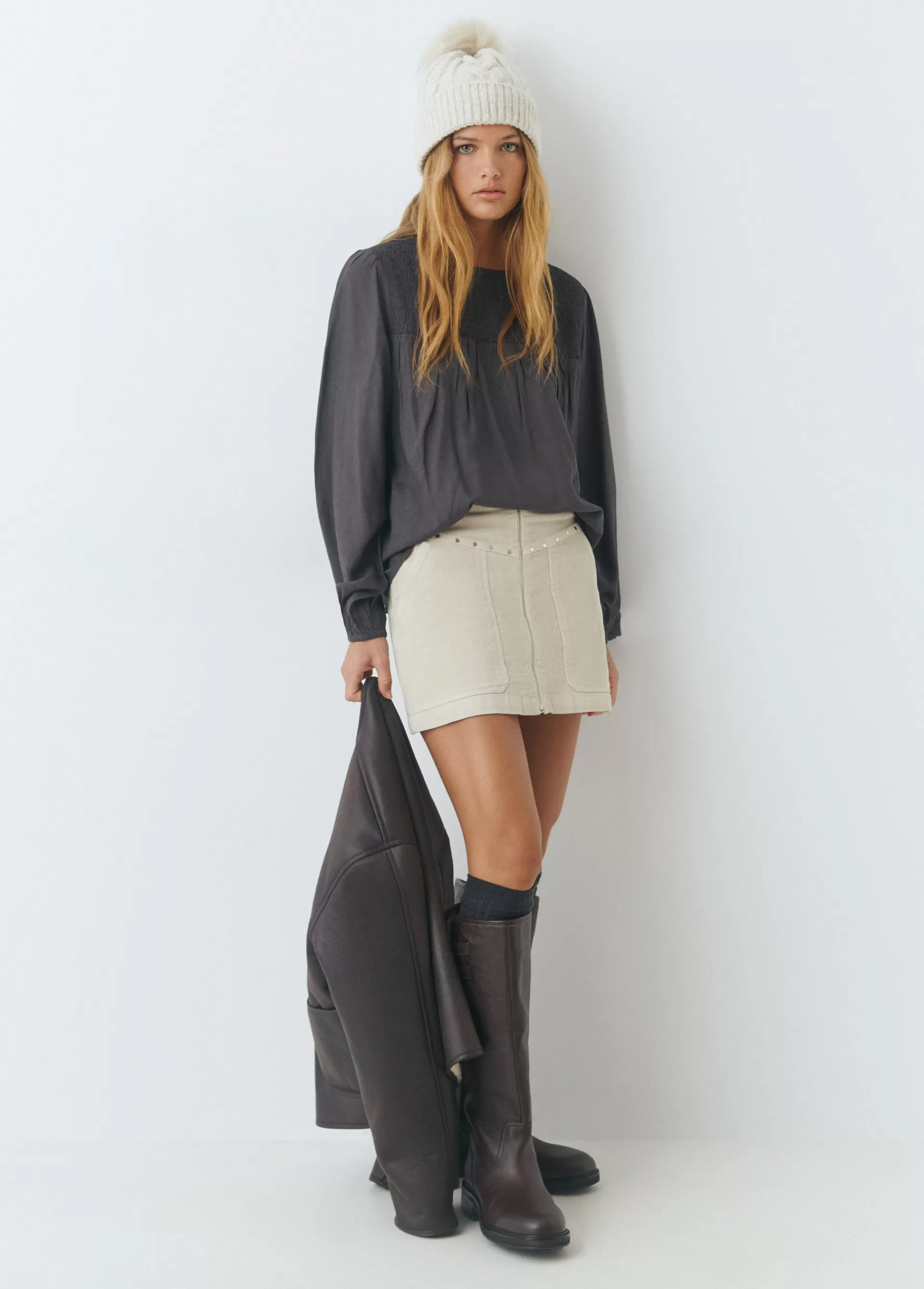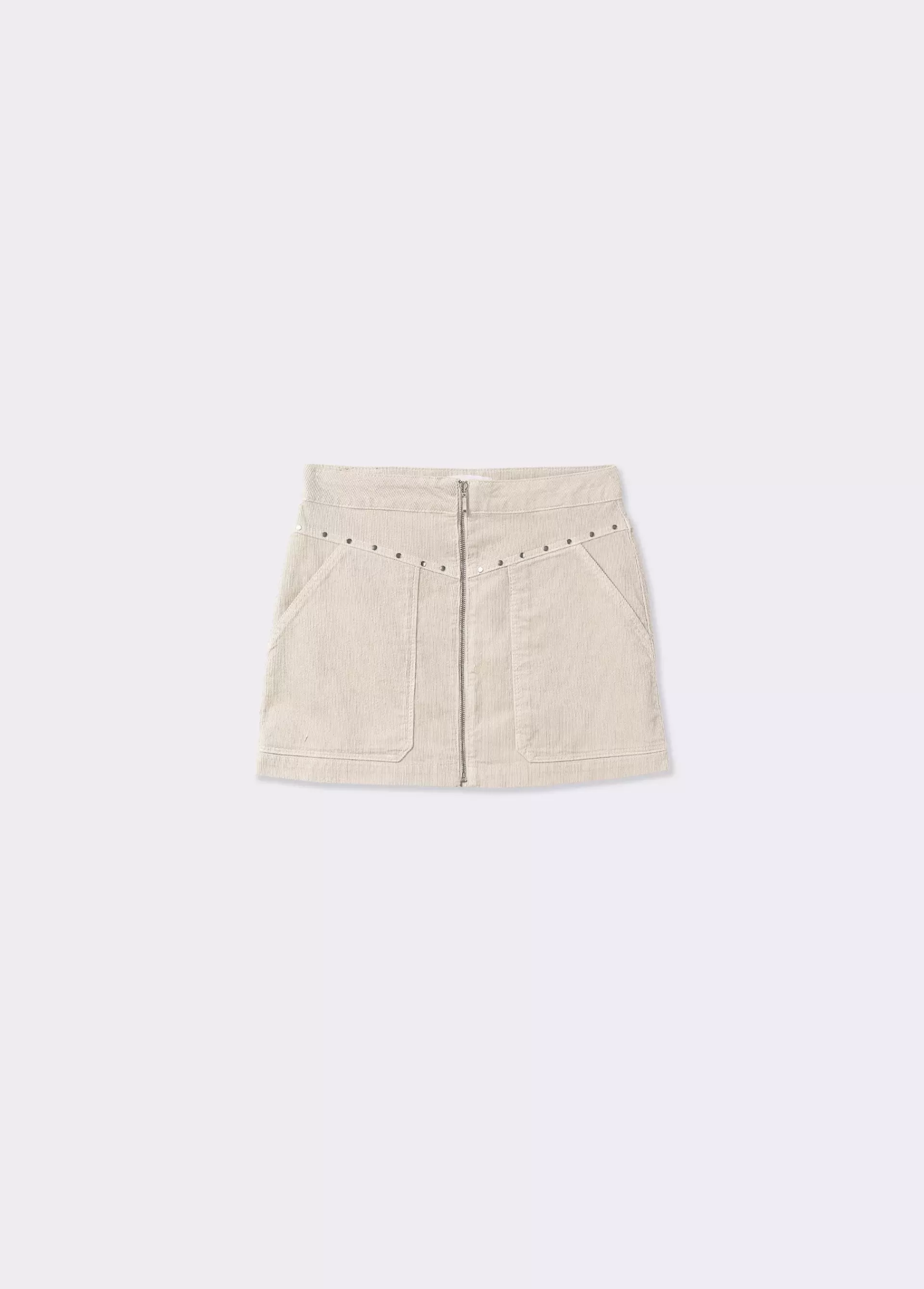 Falda corta de pana con detalle de tachas y apertura con cremallera.