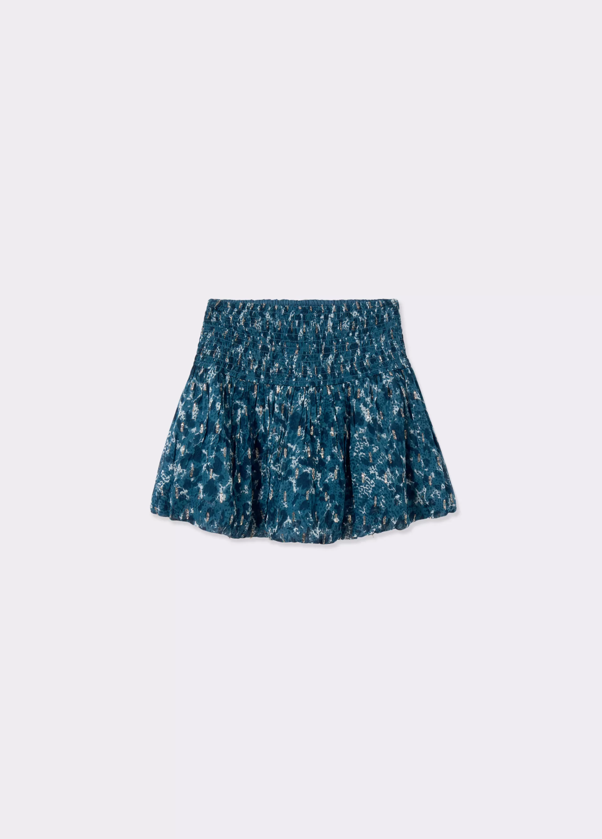 Falda corta tipo globo estampada con goma en la cintura y lurex.