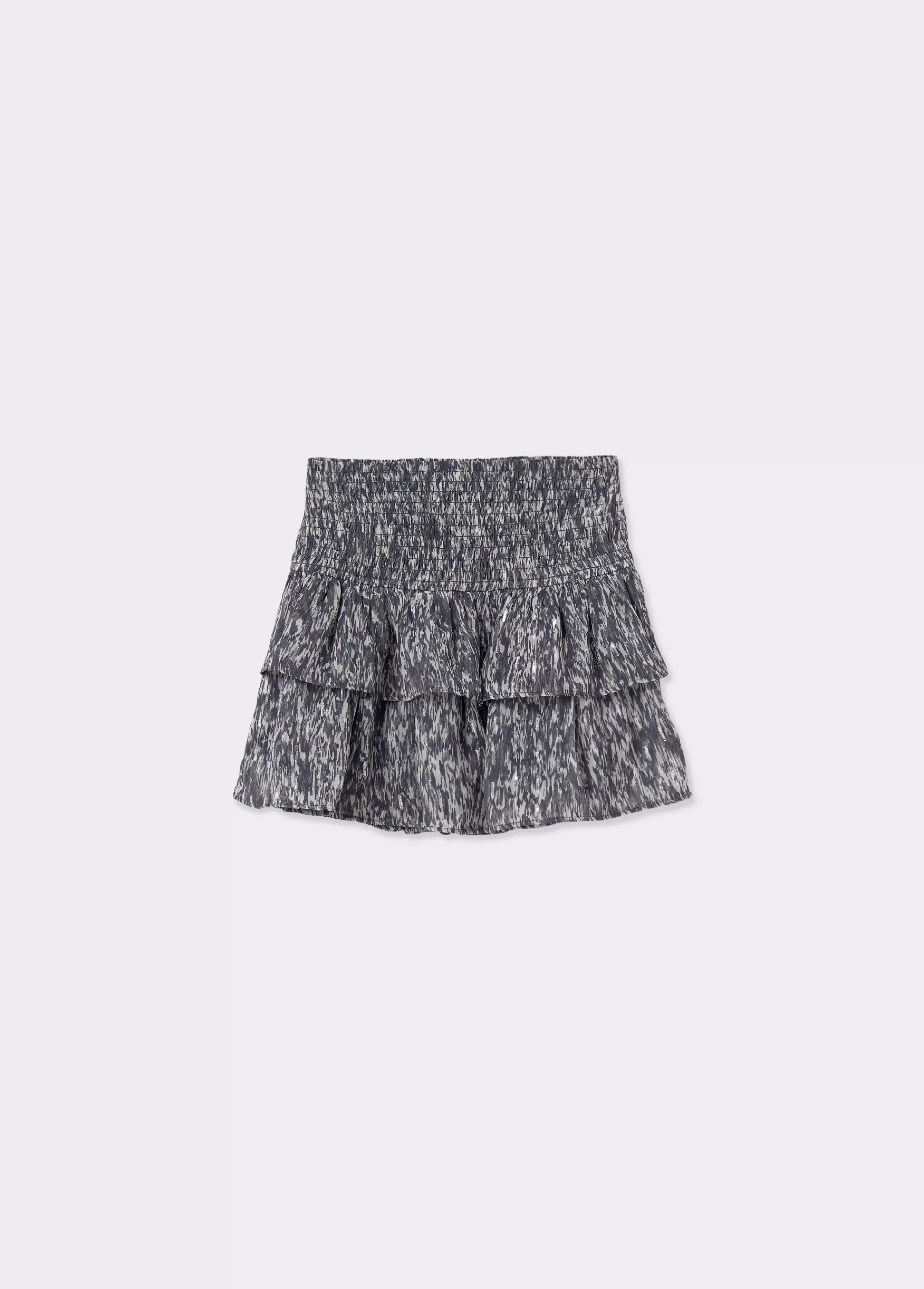 Falda pantalón corta estampada con smock y volantes en la parte inferior.