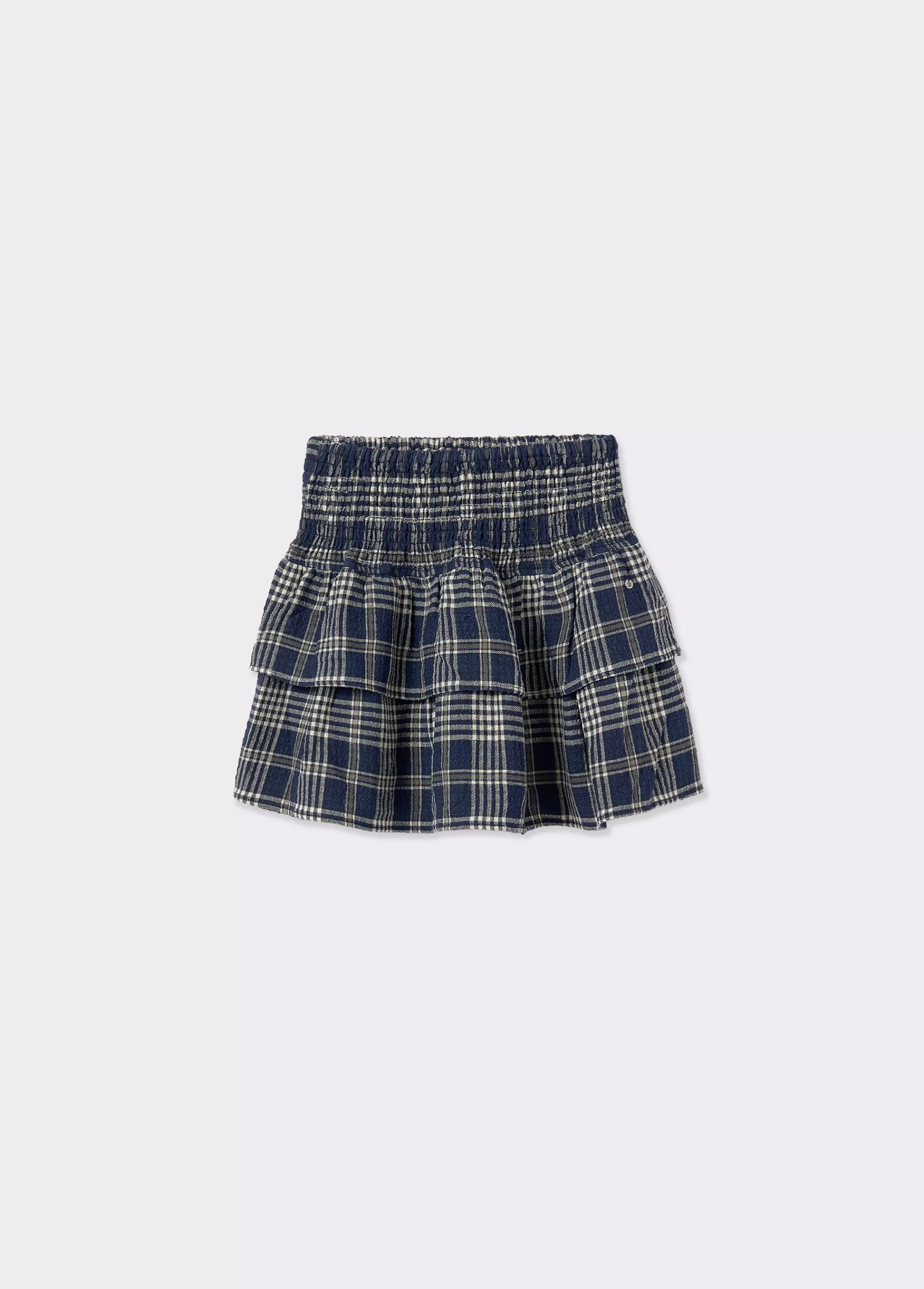 Falda pantalón corta de cuadros con smock y volantes en la parte inferior.