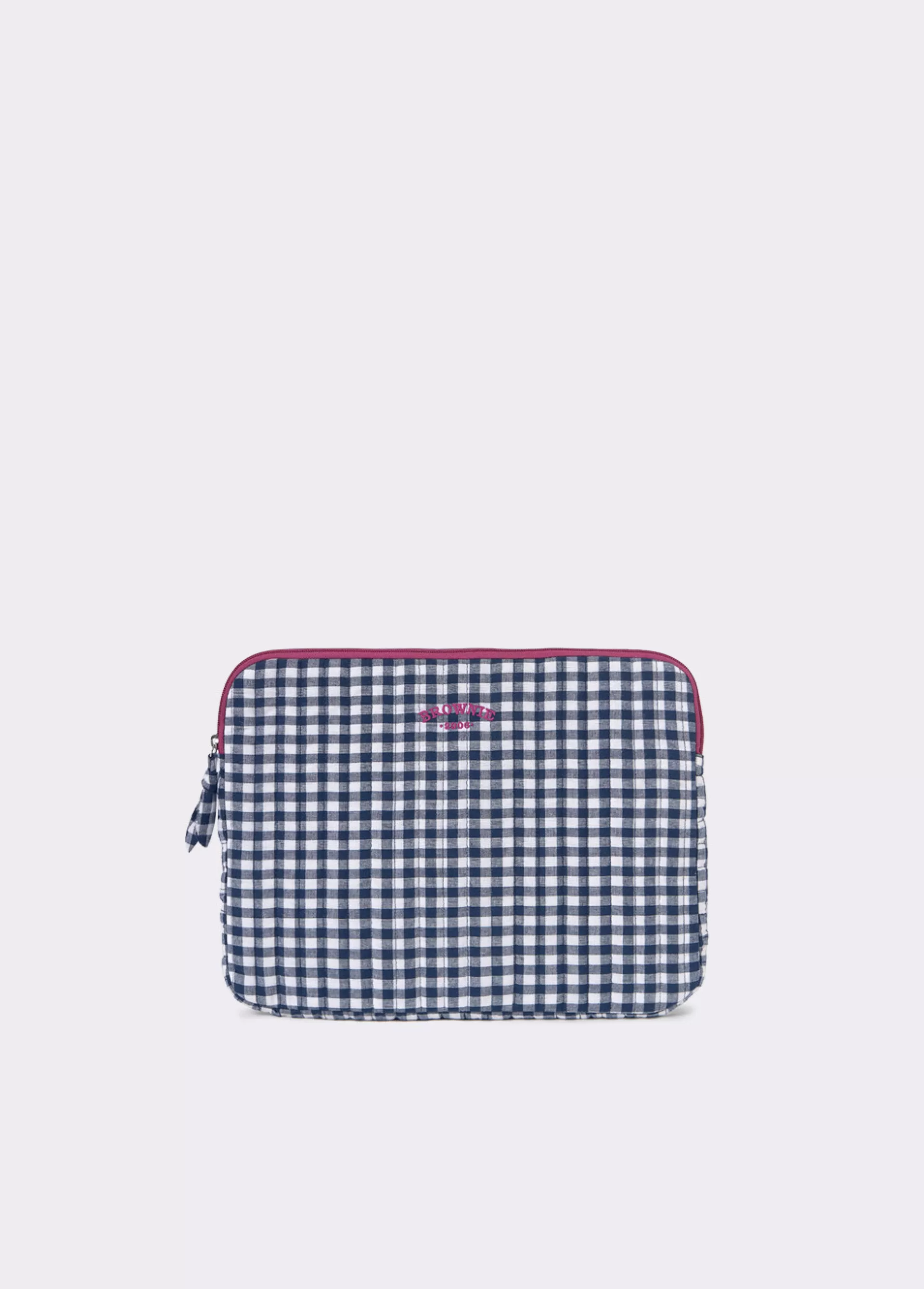 Funda de portátil de cuadros con logo Brownie y cierre mediante cremallera. Contiene un compartimento en la parte exterior