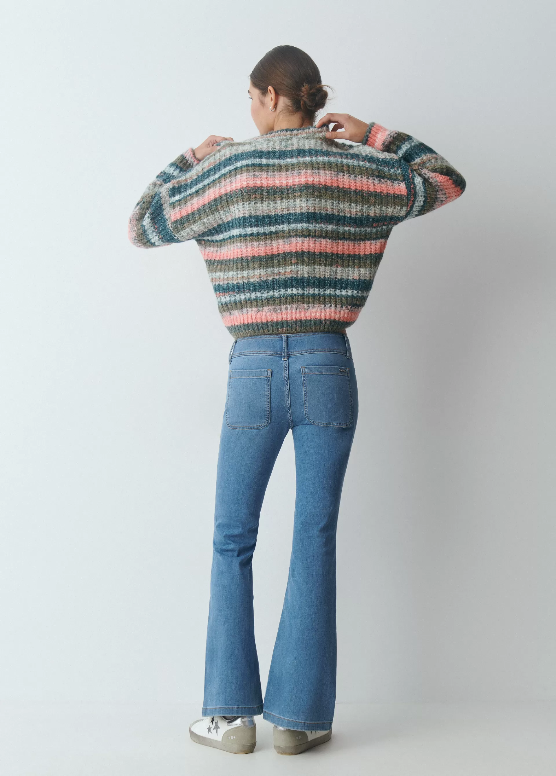 Tejano de campana con cintura ancha y cinco bolsillos. Cierre mediante cremallera y dos botones en el frontal.