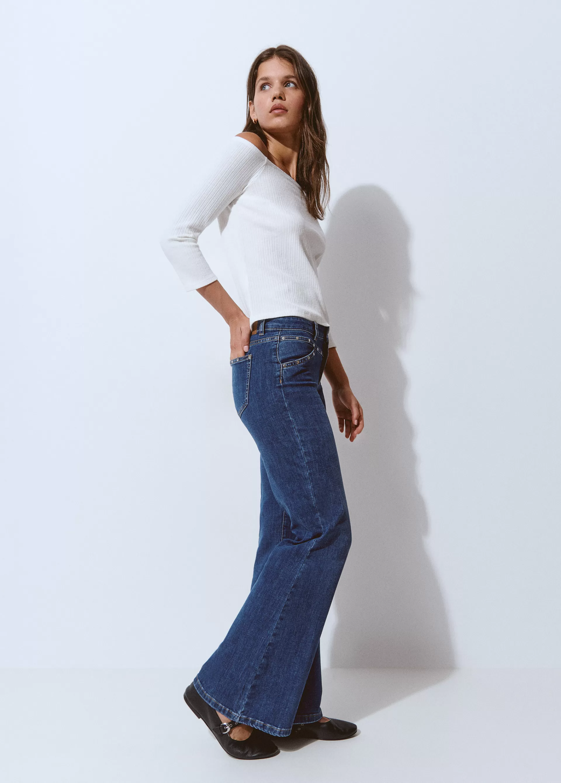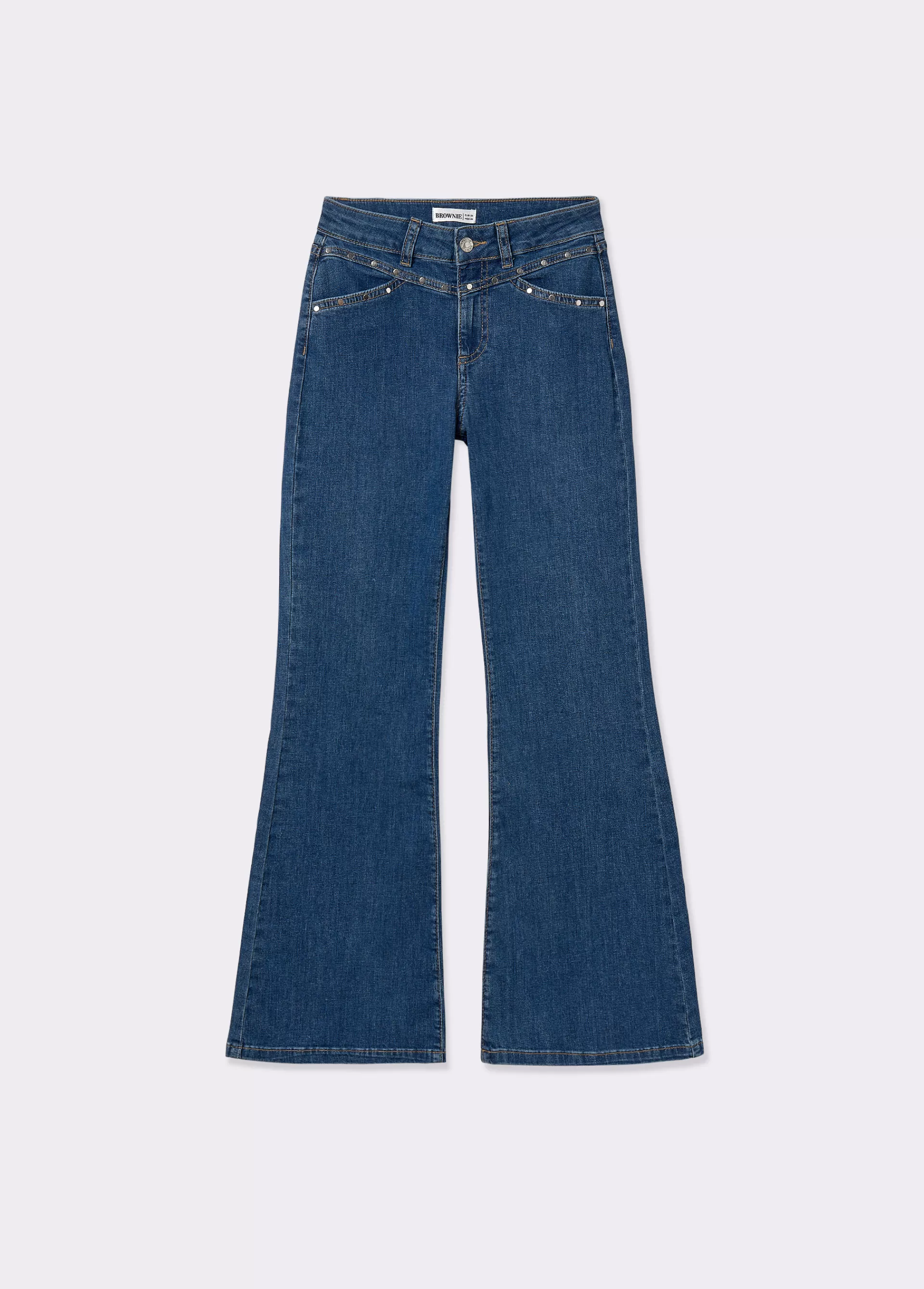Vaqueros culotte de tiro medio con detalle de tachas. Cierre mediante cremallera y botón.
