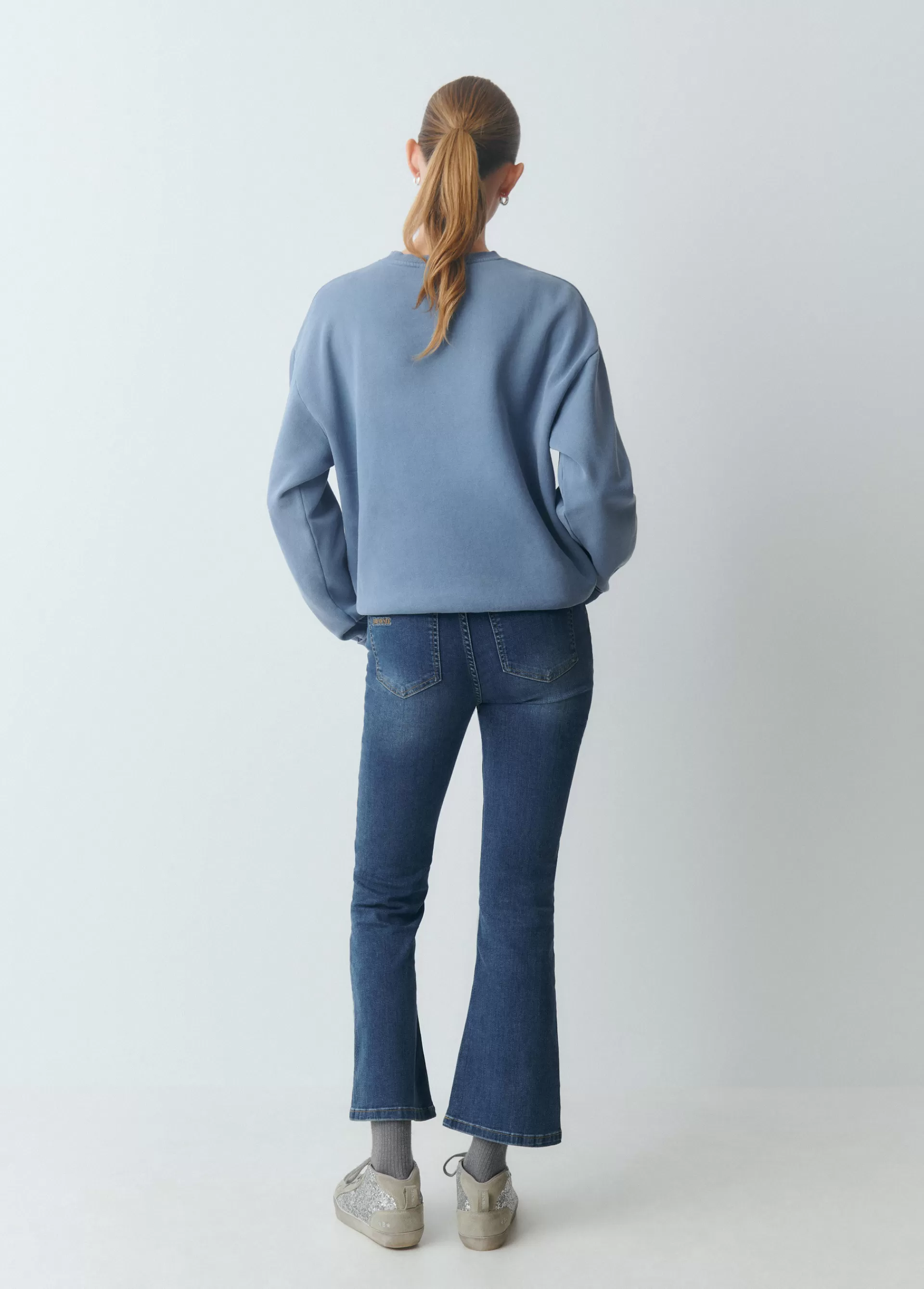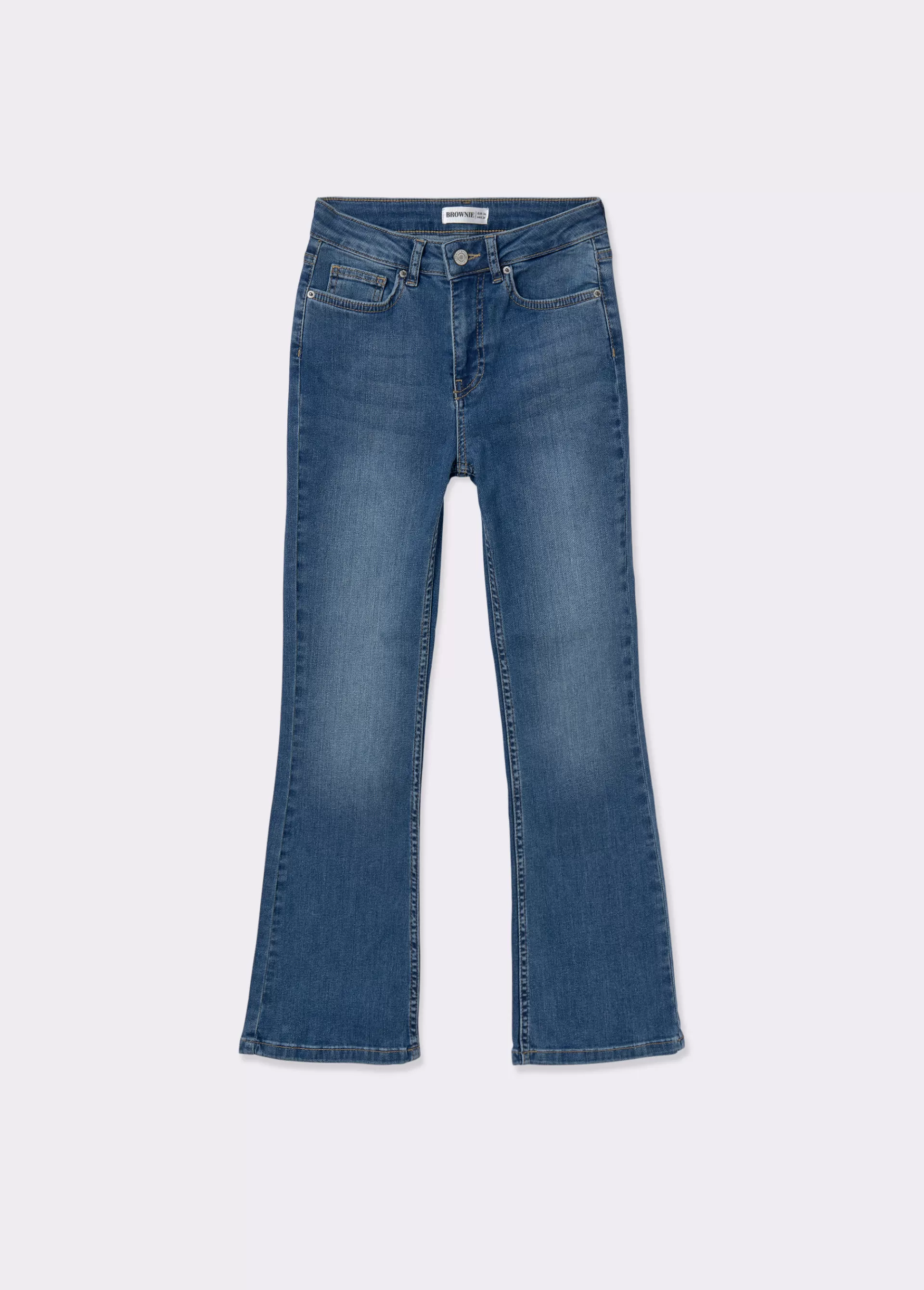 Tejano de campana tipo culotte de tiro medio, cinco bolsillos y cierre mediante cremallera y botón en el frontal.