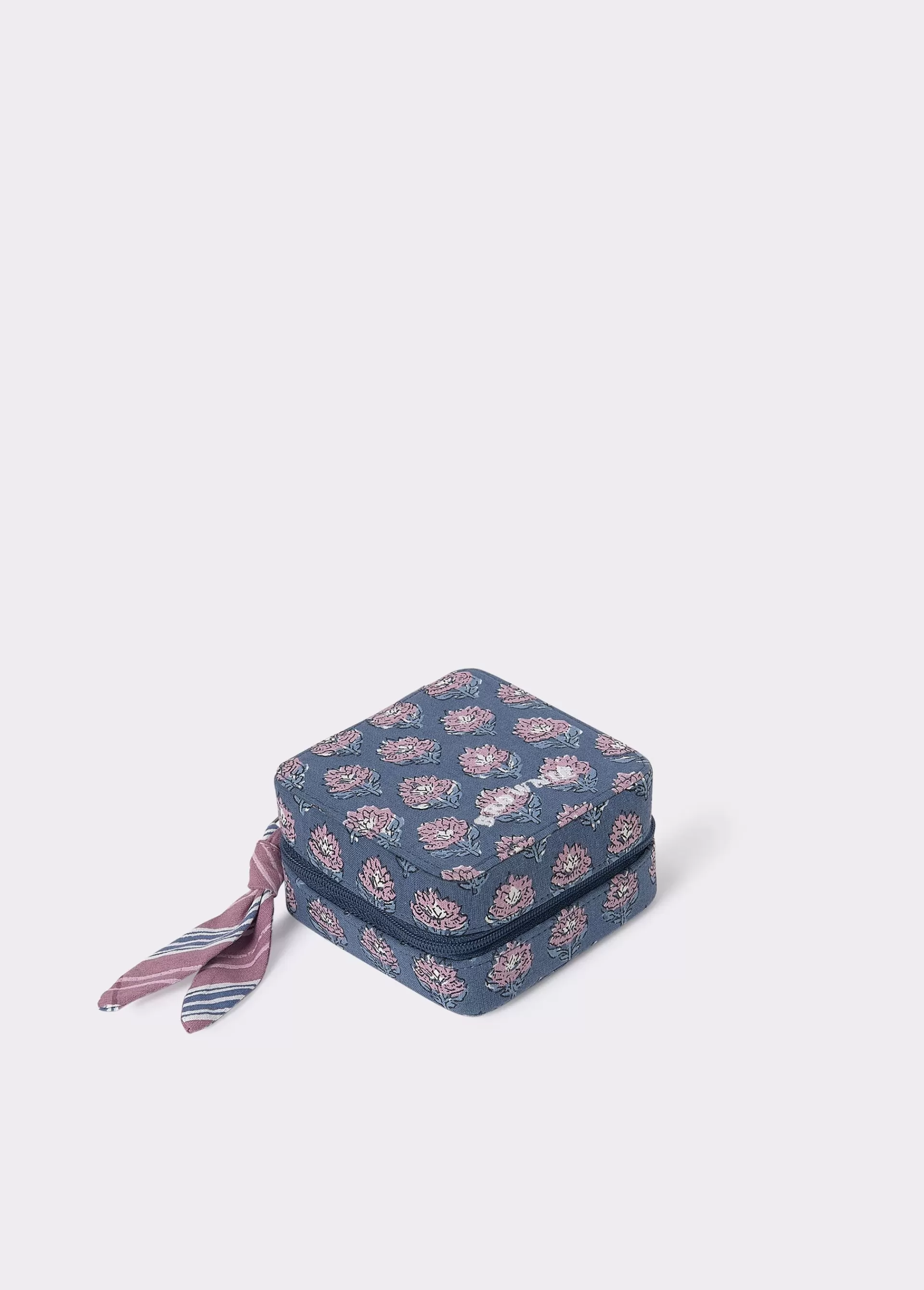 Joyero cuadrado estampado con logo bordado en la parte superior, cremallera y compartimento en el interior.