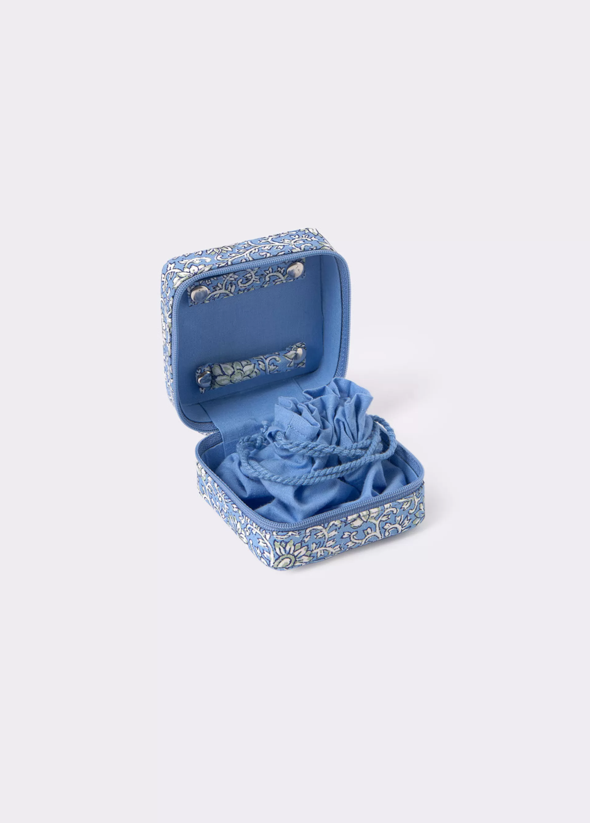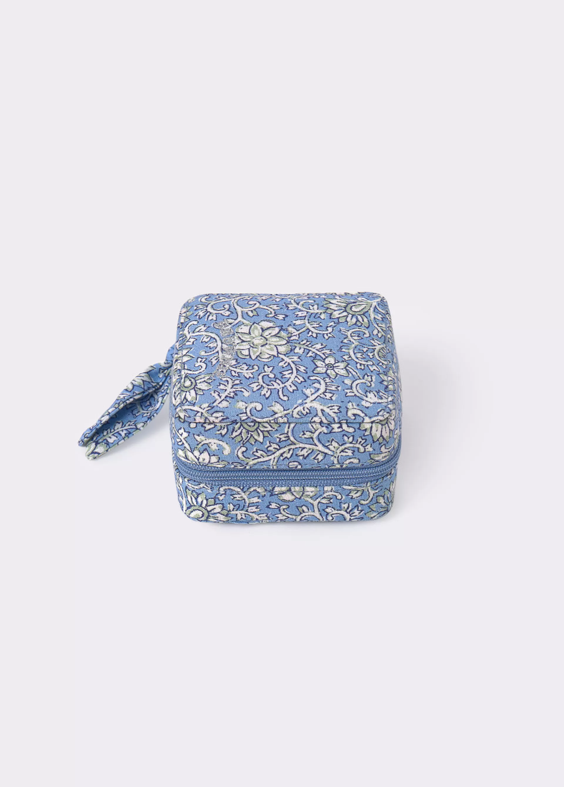 Joyero cuadrado estampado, cremallera y compartimento en el interior.