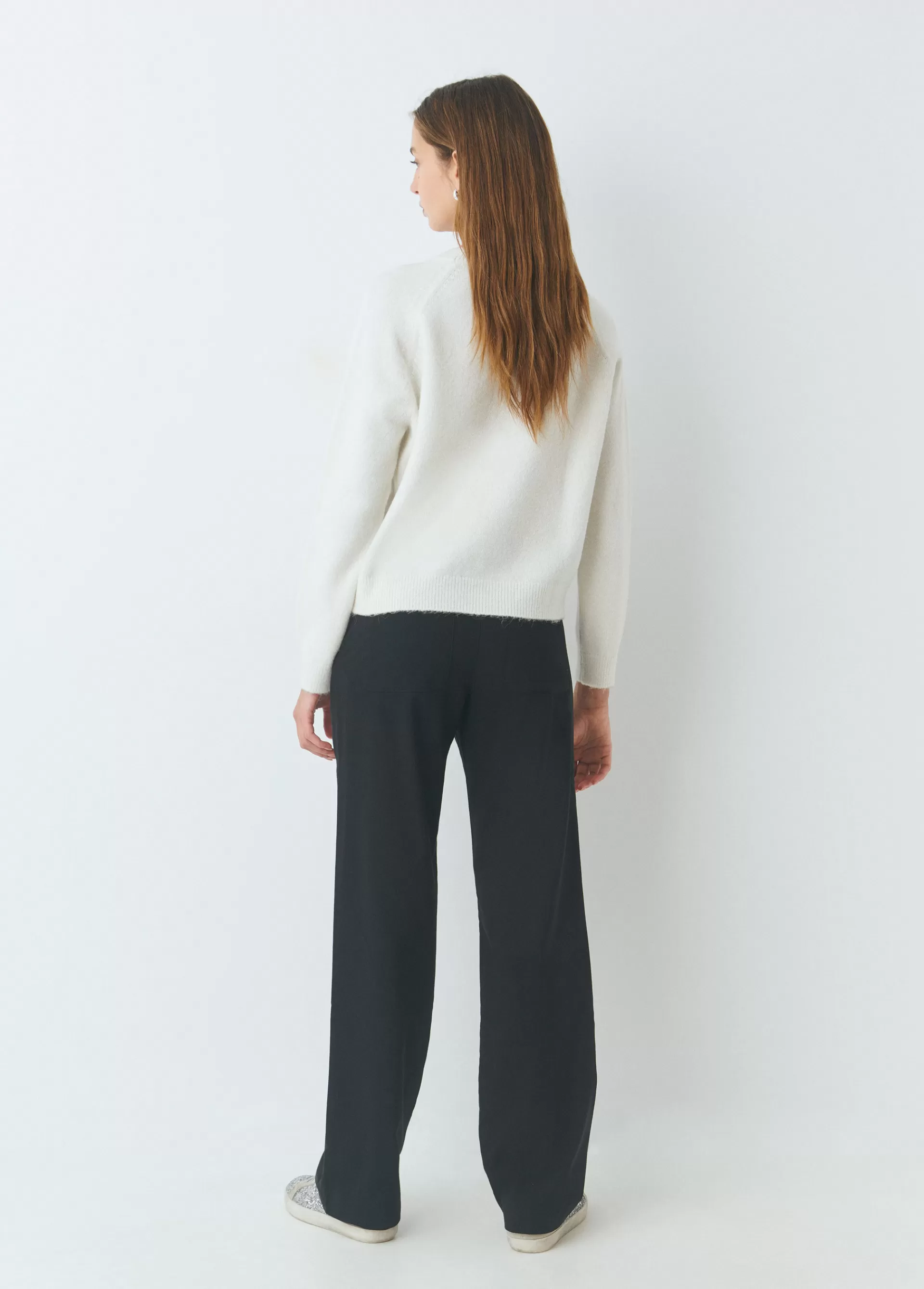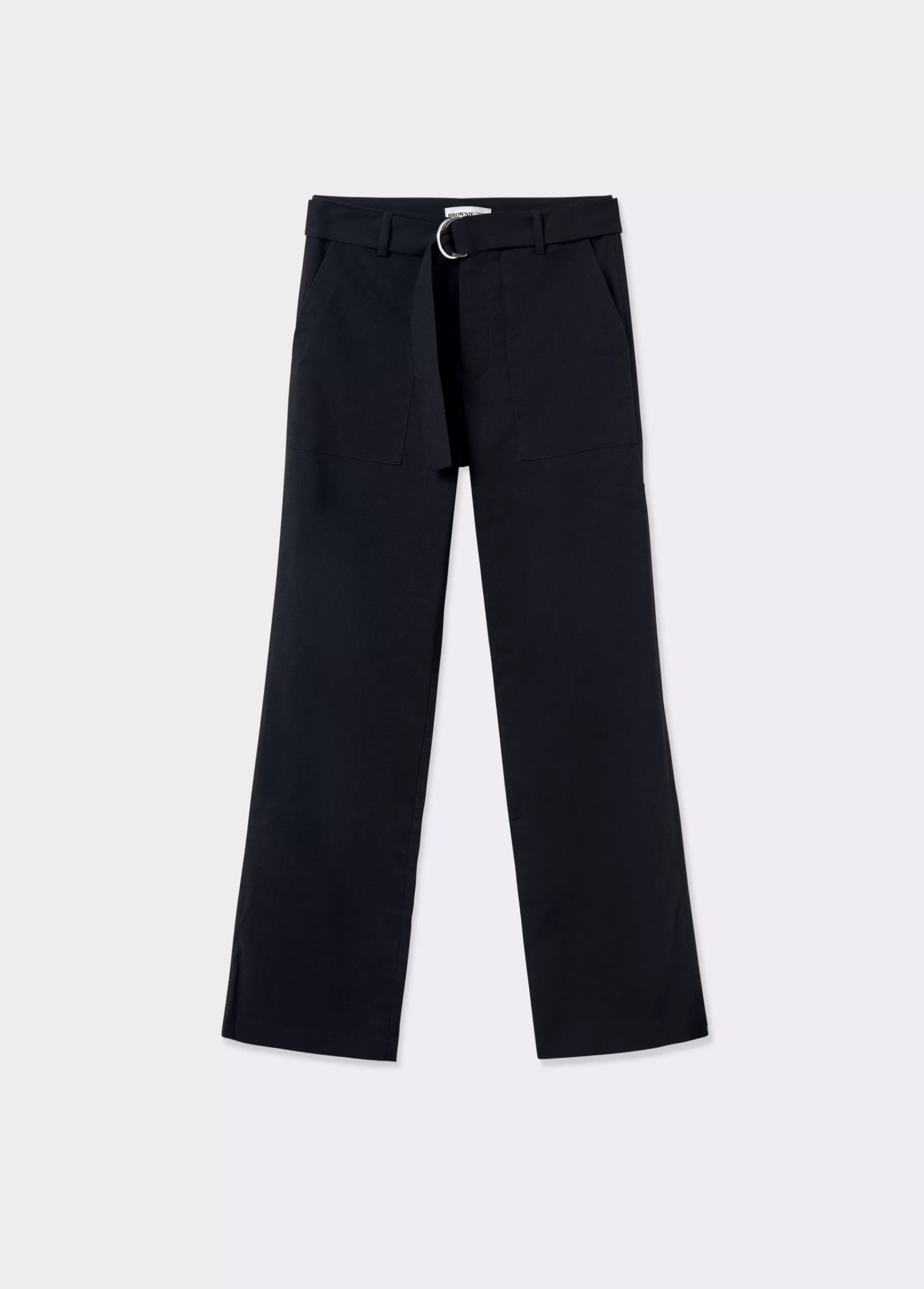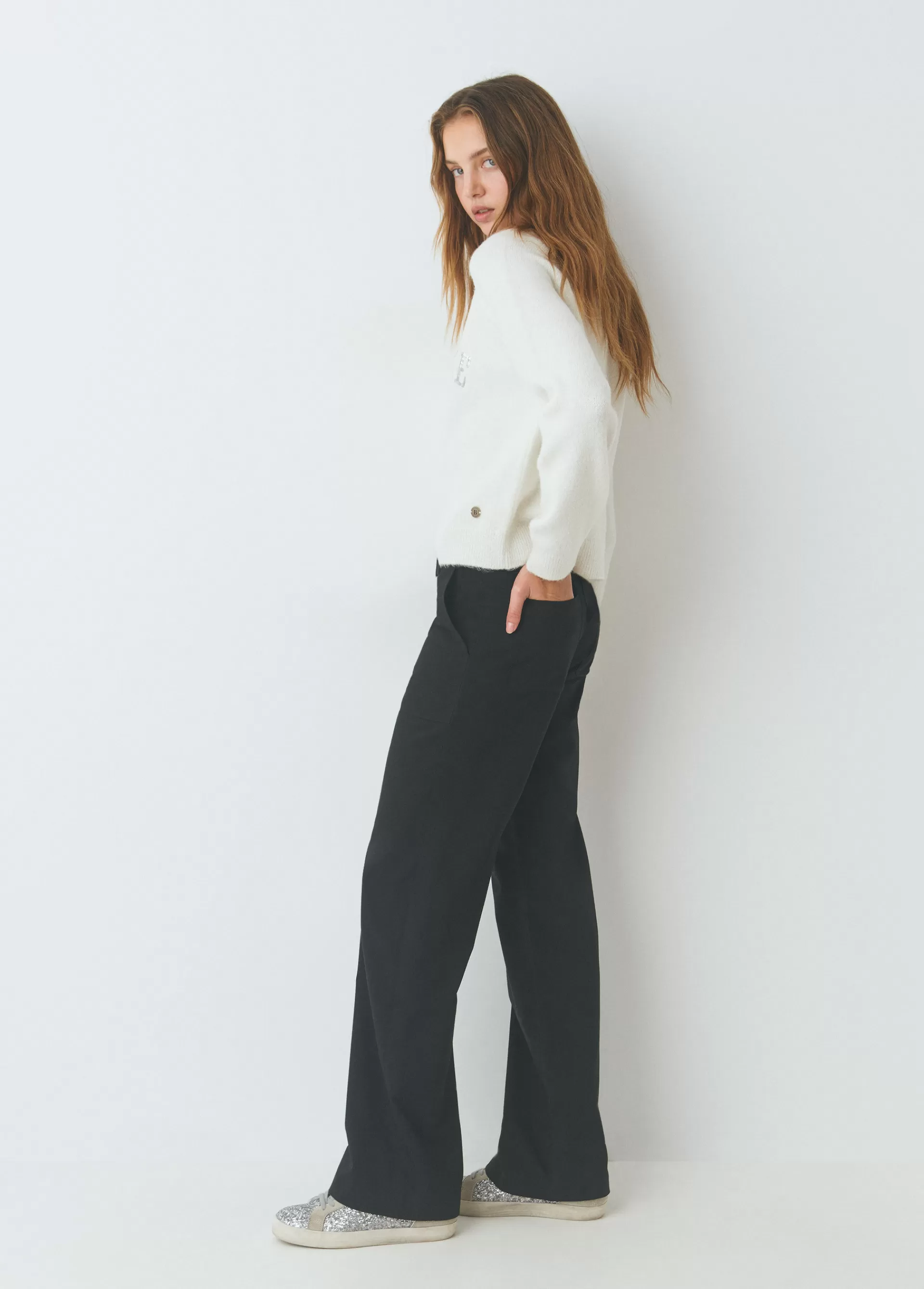 Pantalón recto con detalle de cinturón y bolsillos. Cierre mediante cremallera y botón.