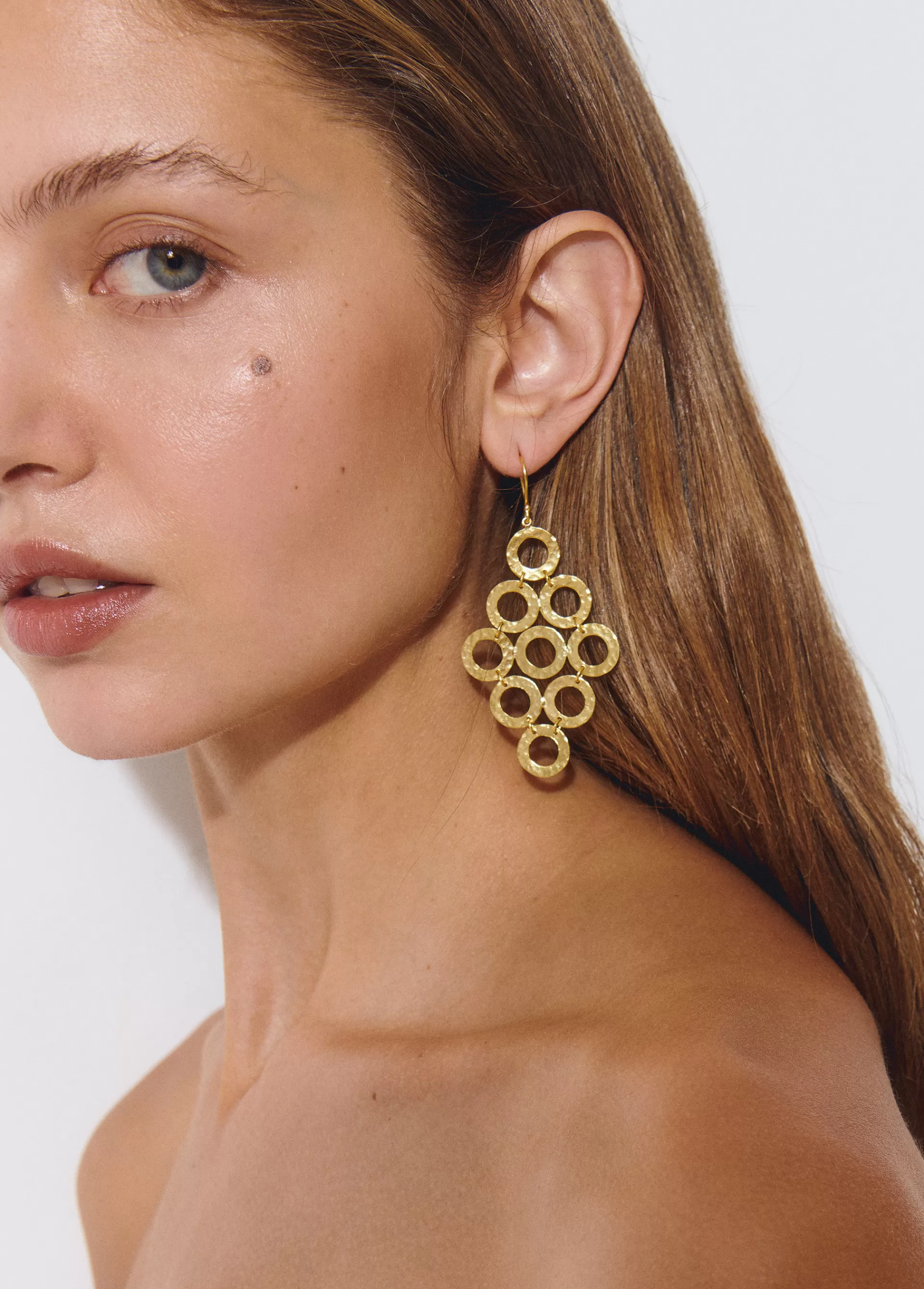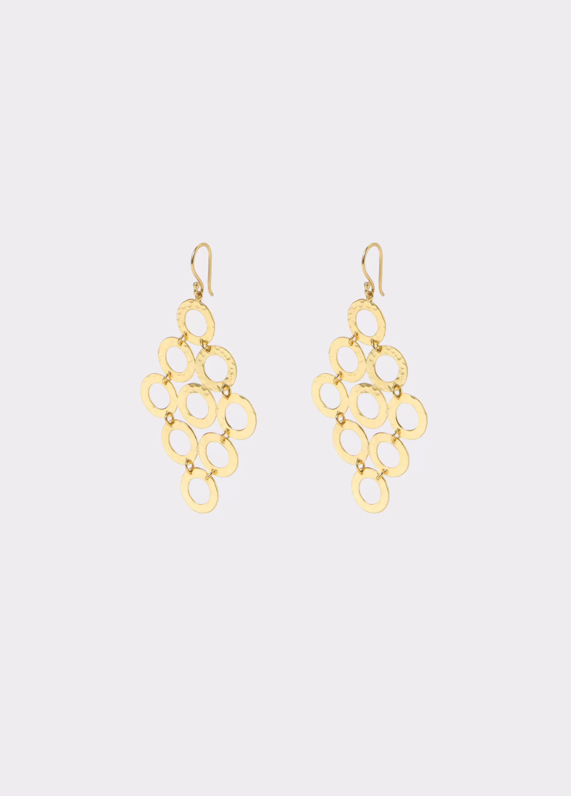 Pendientes en forma de rombos dorados con varios aros en forma circular. Cierre de gancho.