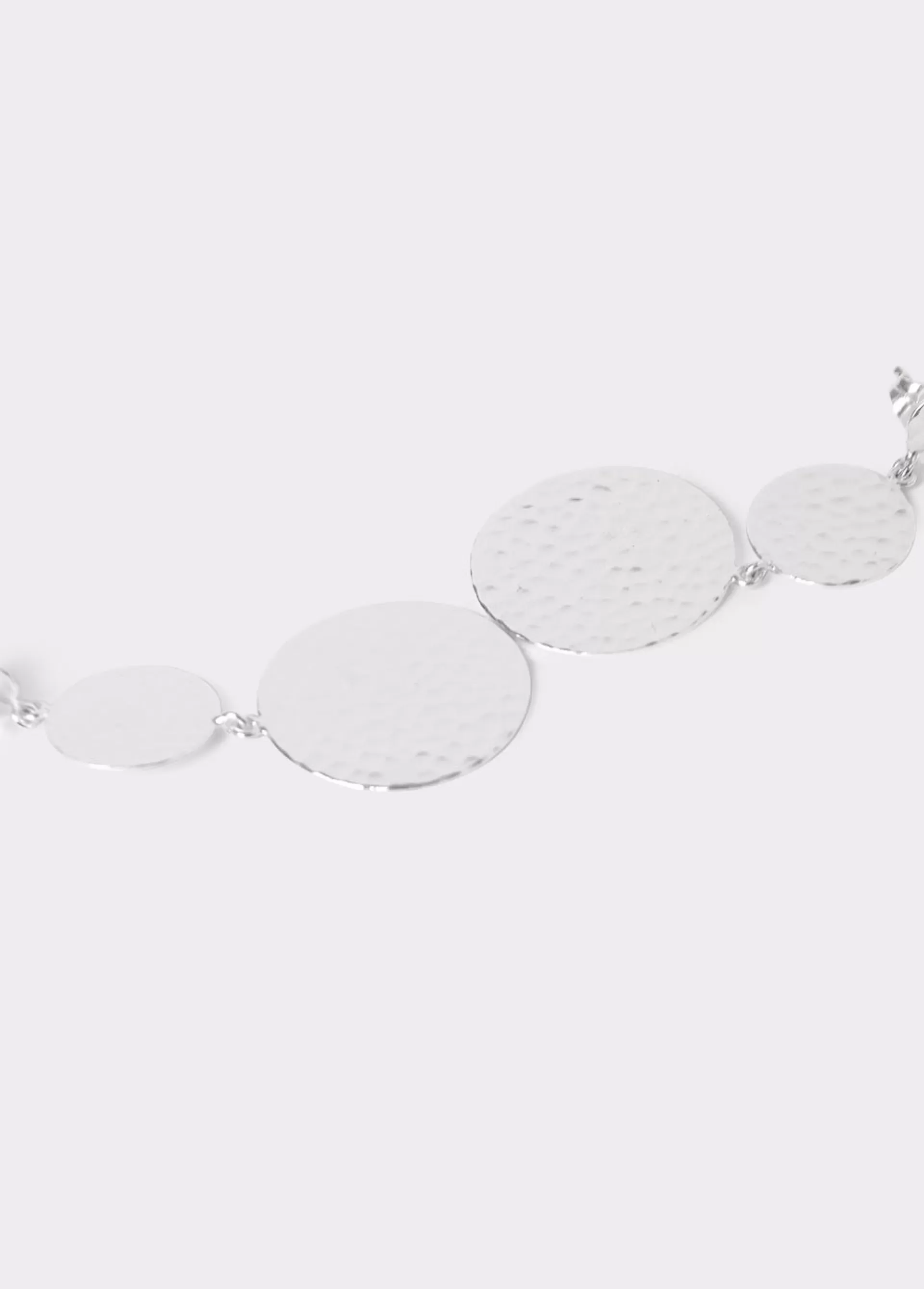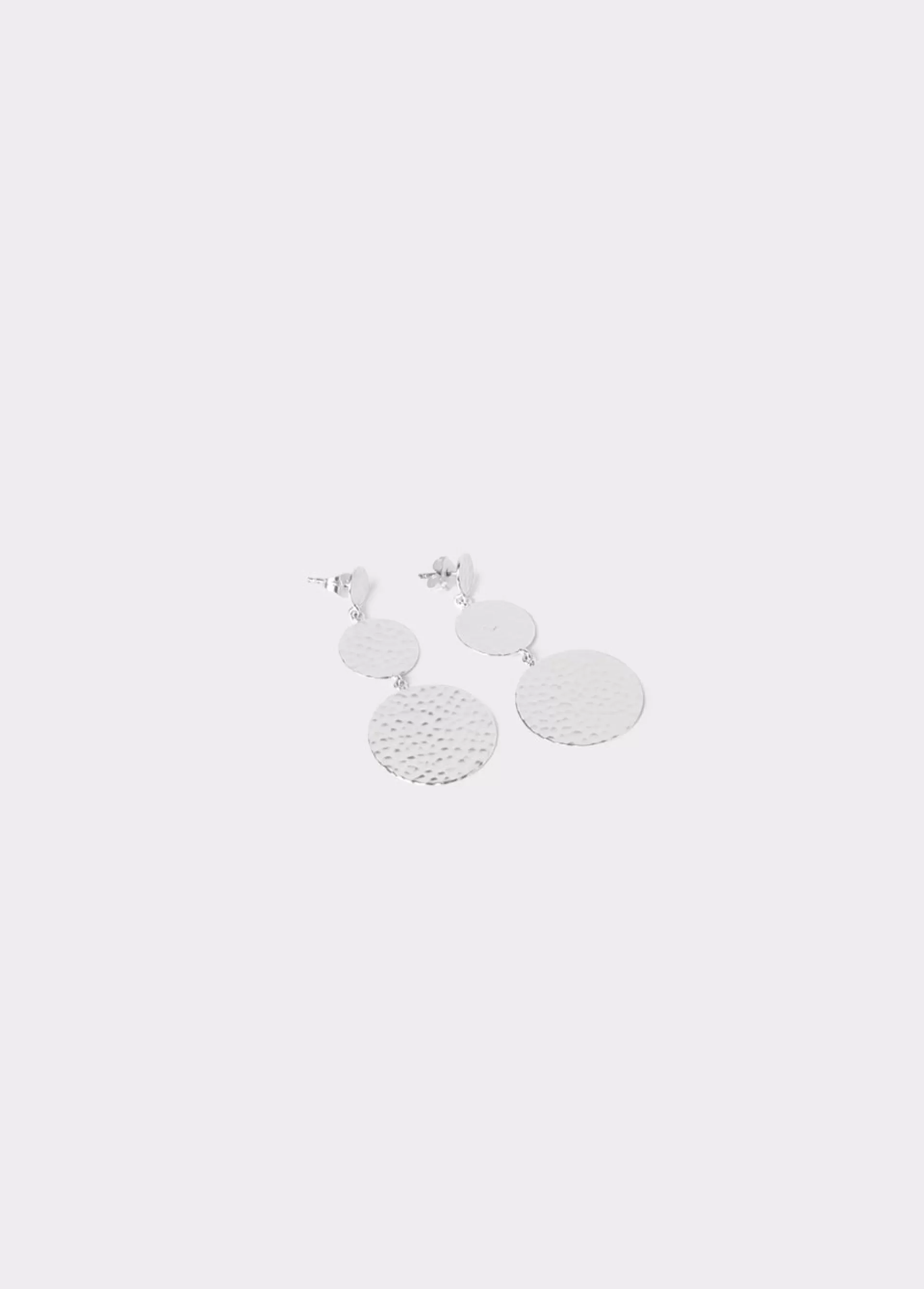 Pendientes largos plateados con forma de tres discos. Cierre de presión.