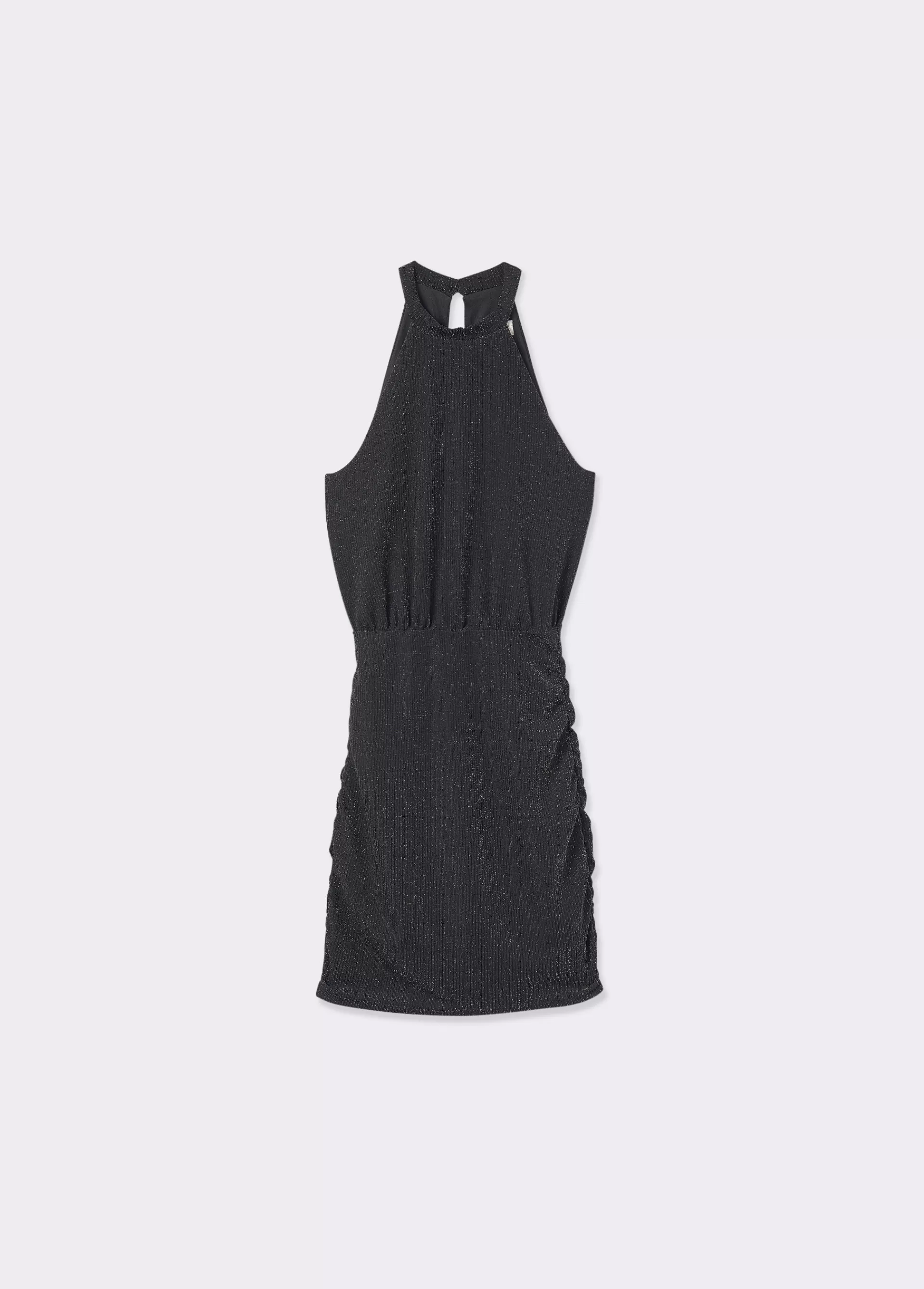 Vestido corto de canalé con cuello halter y detalles con hilo metalizado.