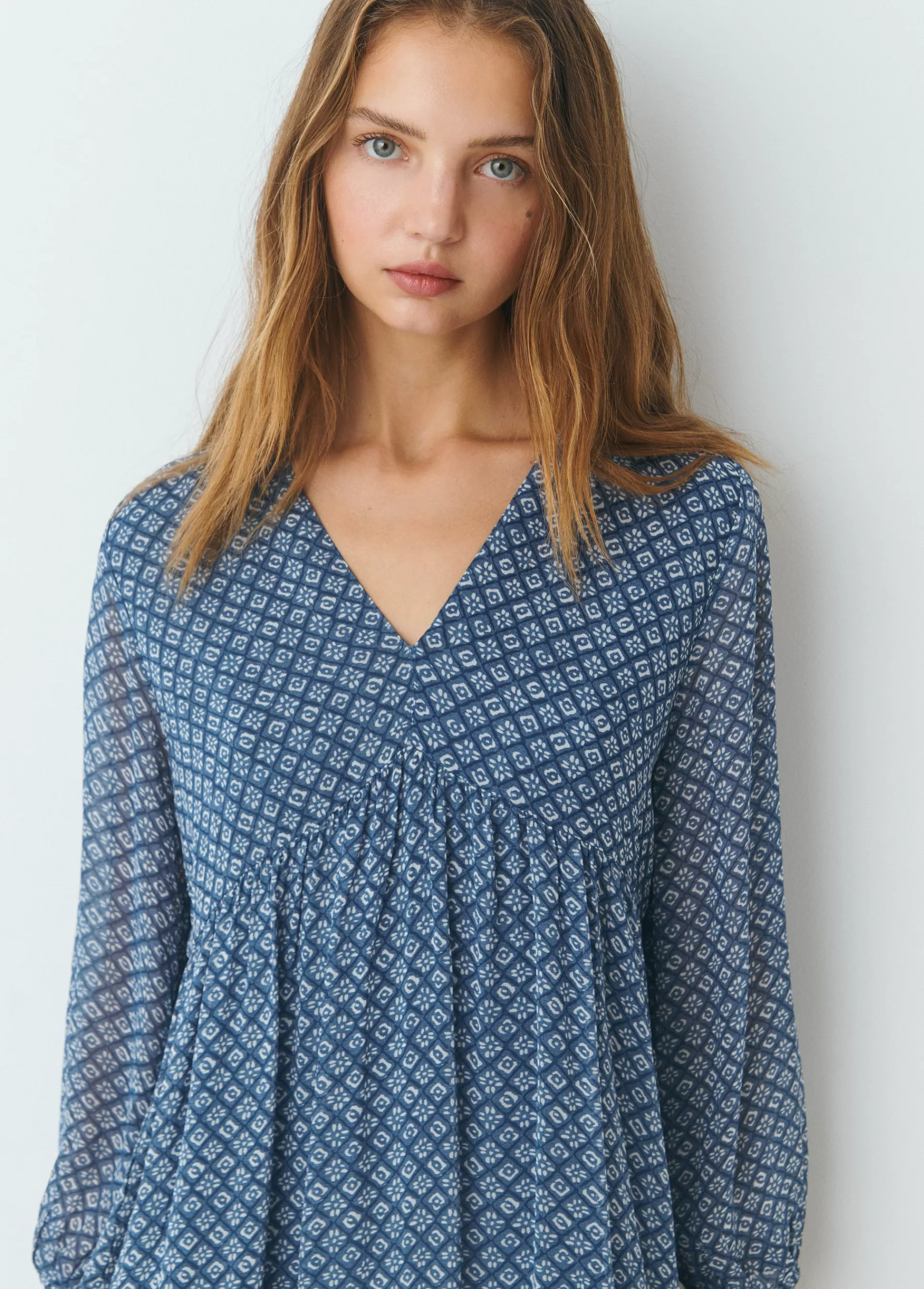 Vestido corto estampado, manga larga abullonada, cuello de pico con lazada y volantes.
