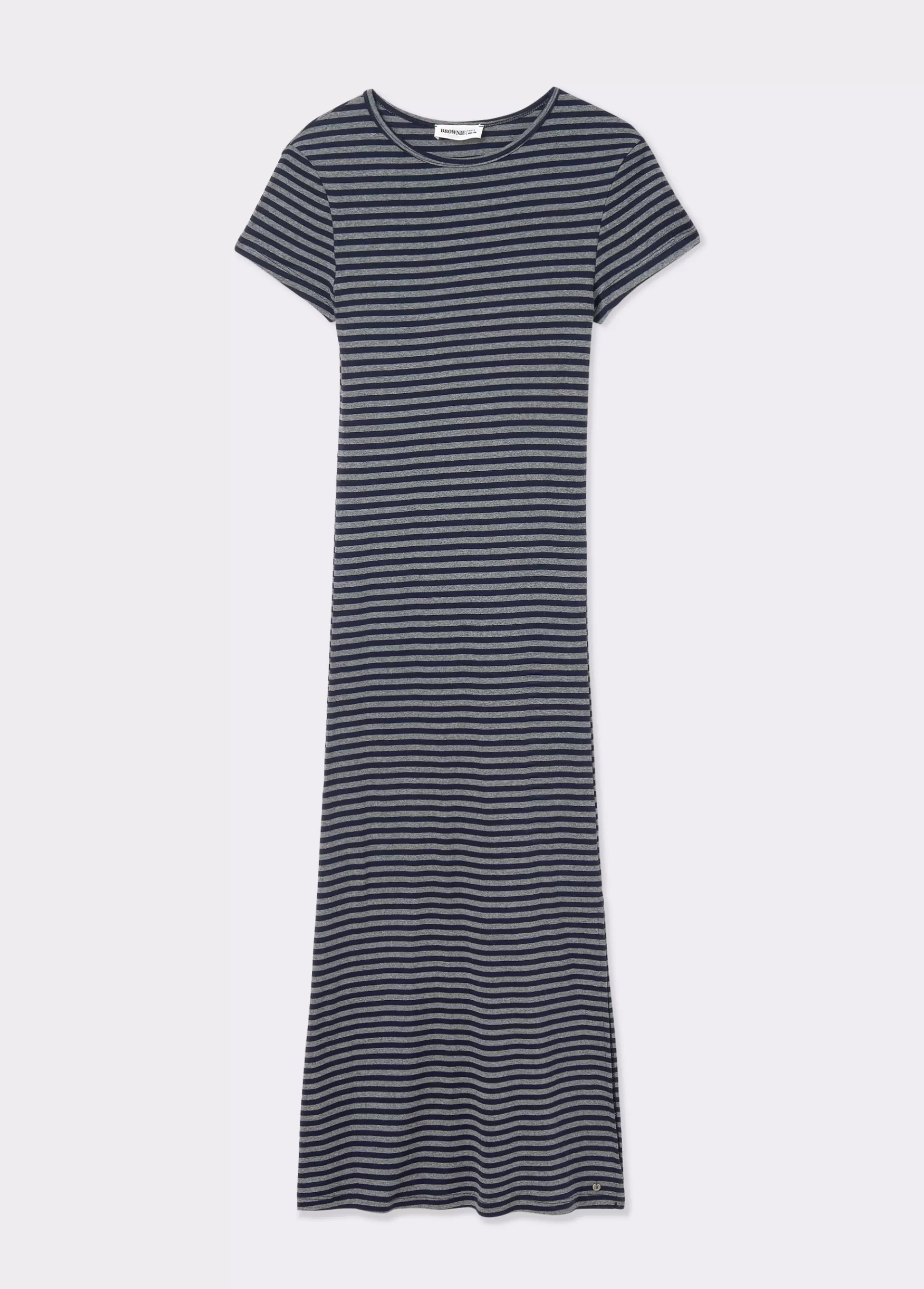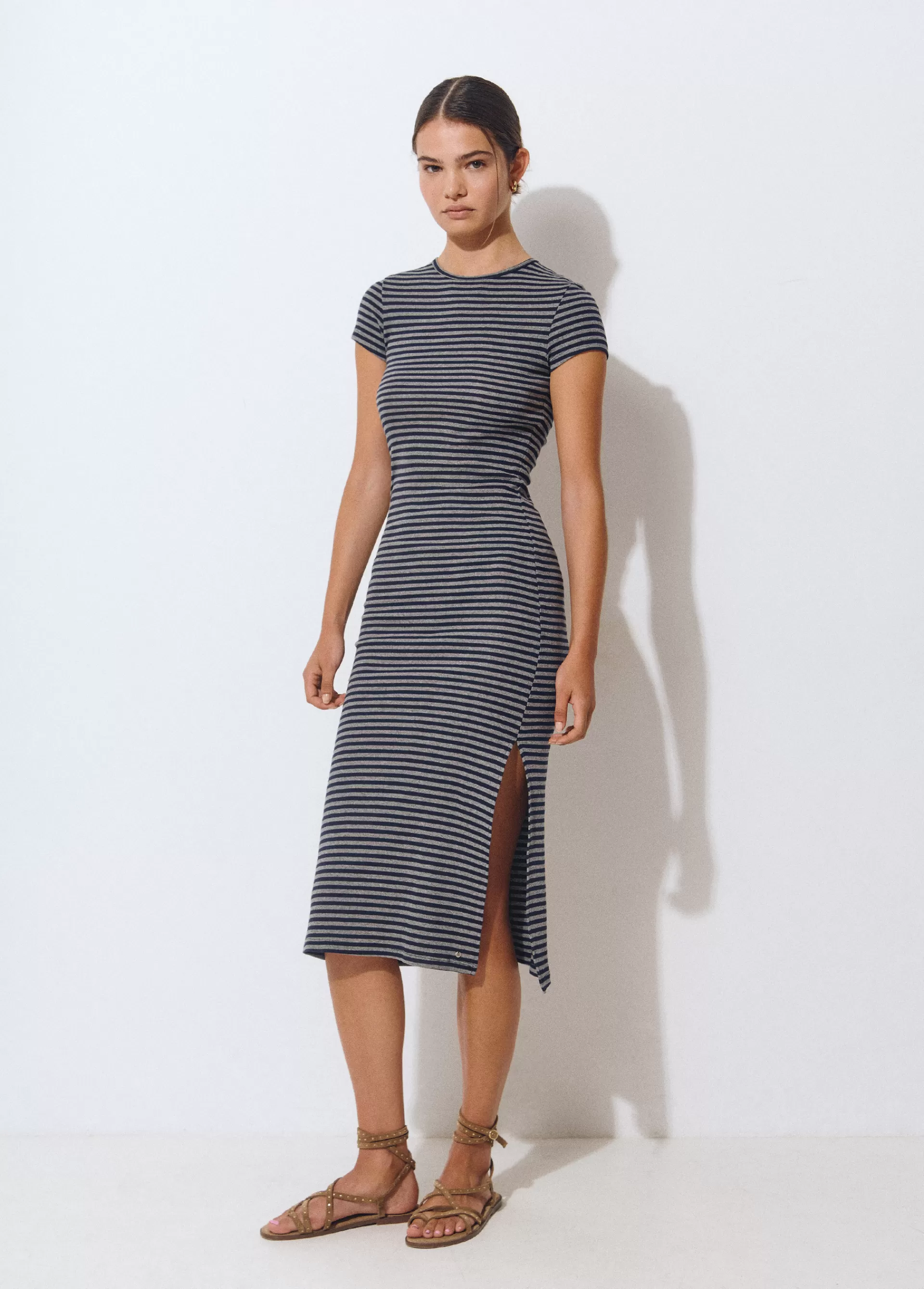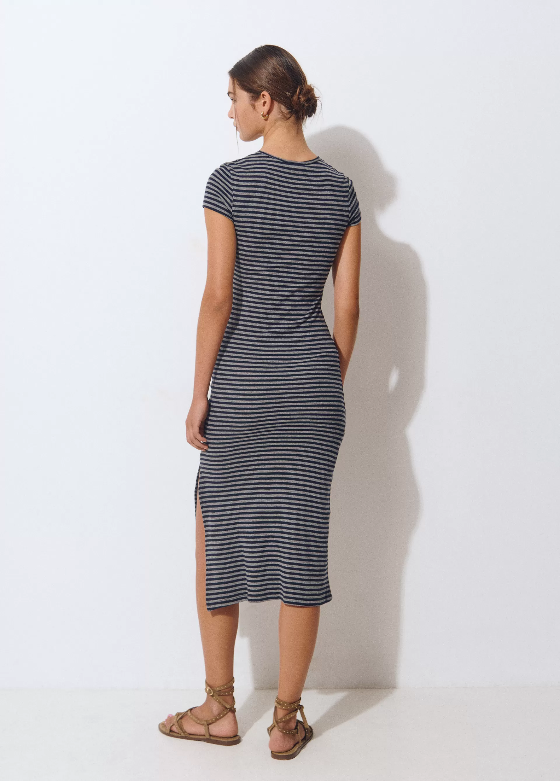 Vestido midi de rayas de manga corta, cuello redondo y detalle de apertura.