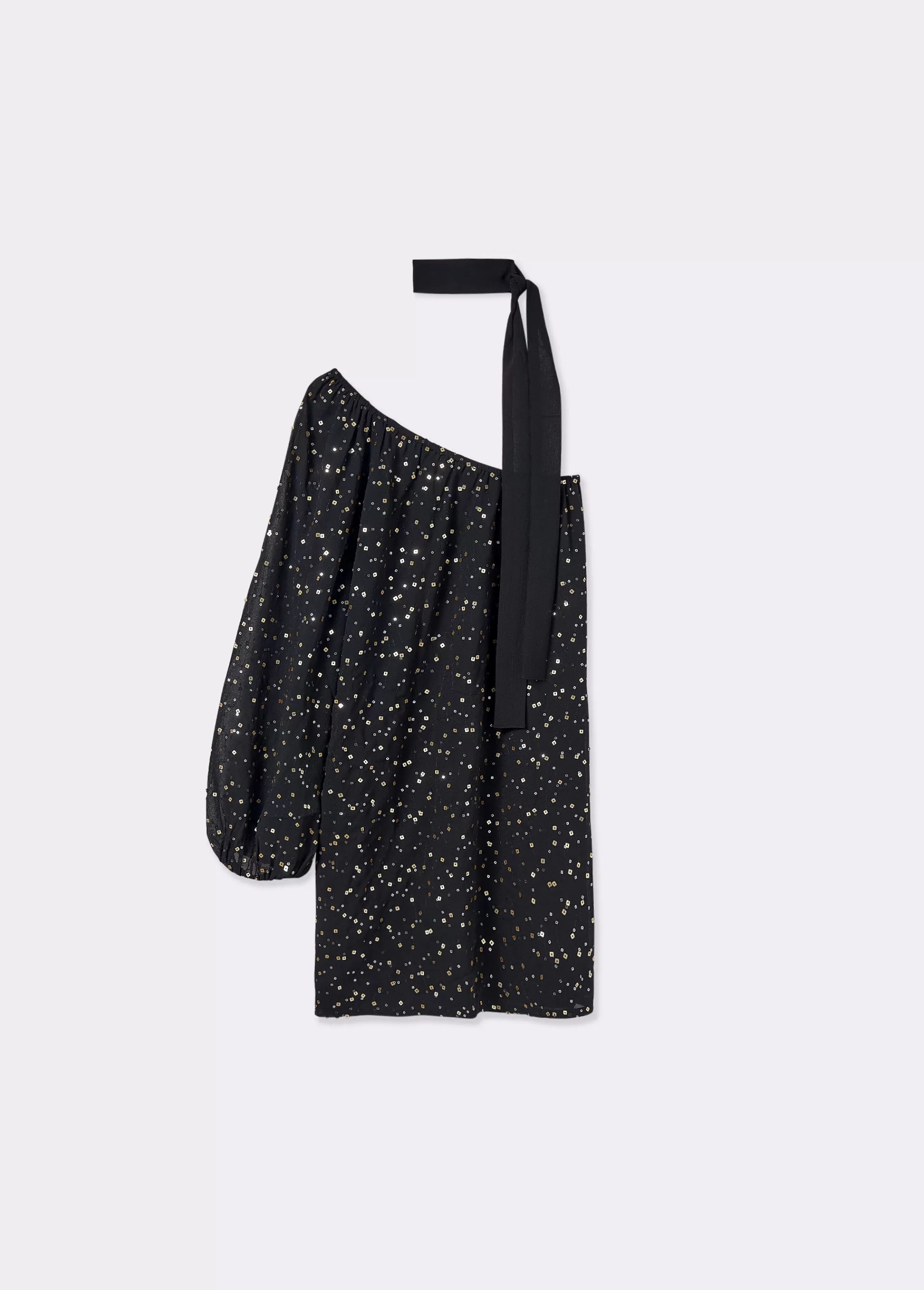 Vestido corto asimétrico con lentejuelas y manga larga abullonada.